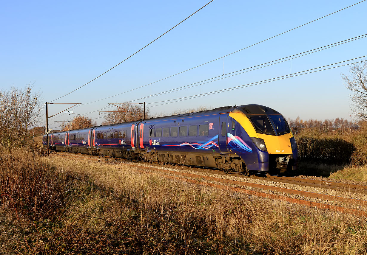 180111 speeds past Rossington on a totally sunny 4 December 2019 with the 1A94 12:33 Hull to Kings Cross Hull Trains service. Note the Hull UK City of Culture 2017 logo just next to the first passenger window.