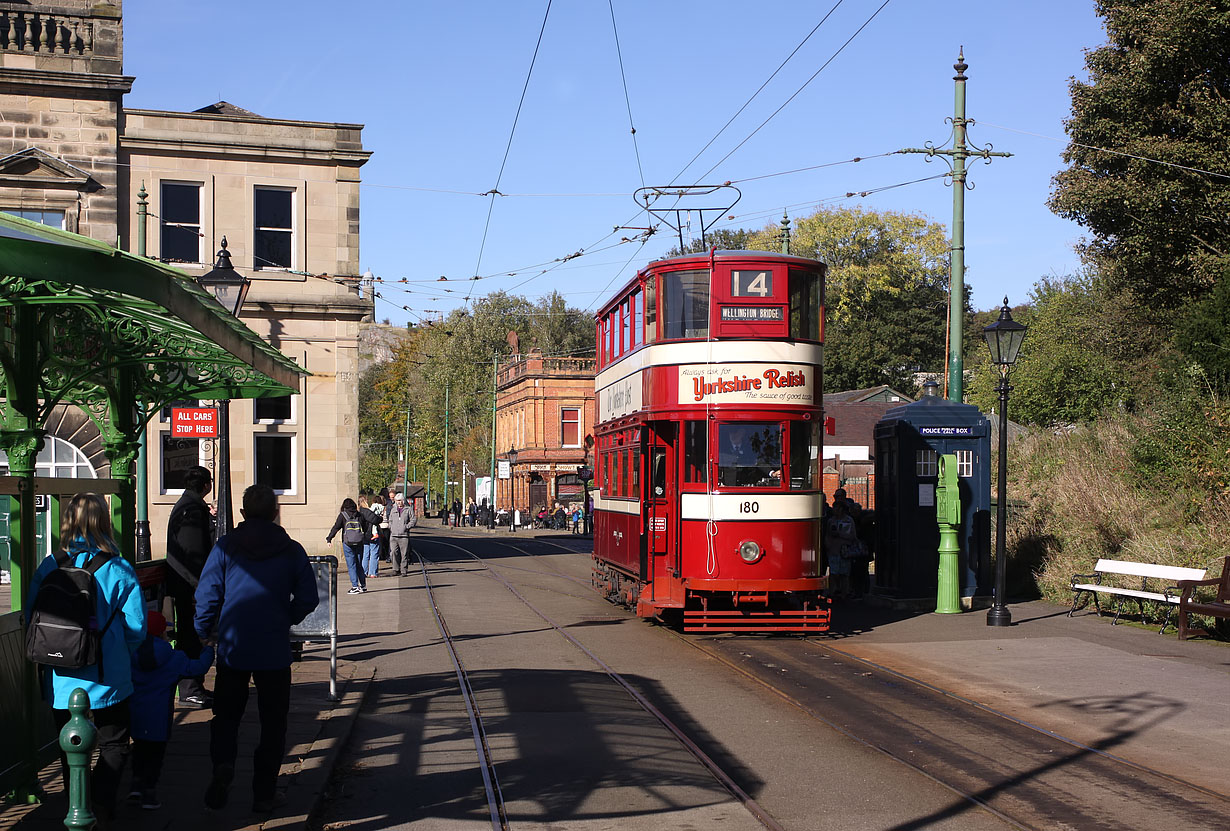 Leeds Corporation Tramways No.180 arrives at the Crich Tramway Village's southern terminus on 15 October 2023. It is passing a Metropolitan Pole Box, and a distinctive light green Bundy Clock, which was used to regulate the running of the trams.