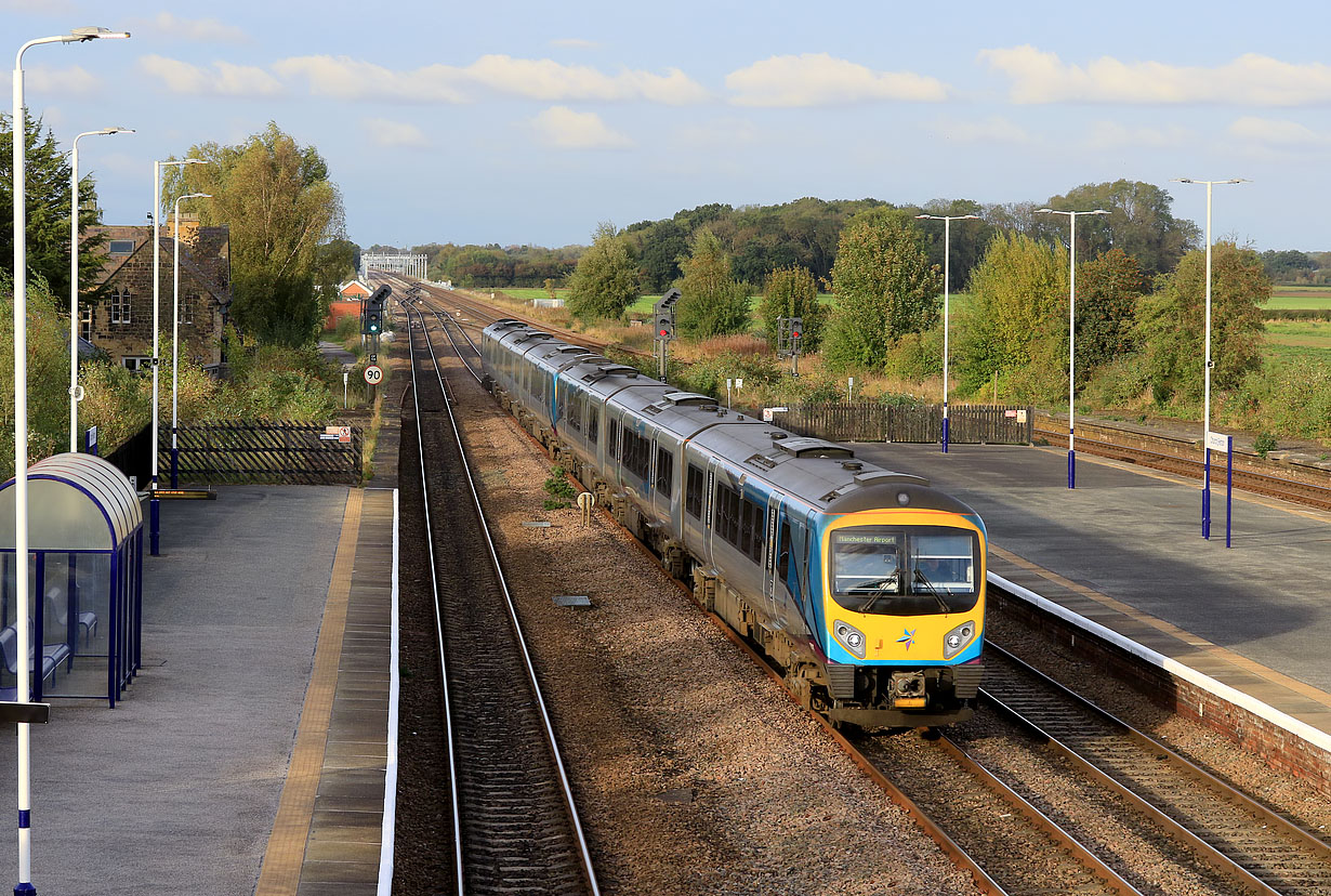 185111 & 185136 pass Church Fenton on 17 October 2023 with the 1P78 14:51 Saltburn to Manchester Airport TransPennine Express service. Note the newly erected 25kV catenary in the background, the first stage of the York to Manchester electfrication scheme. |