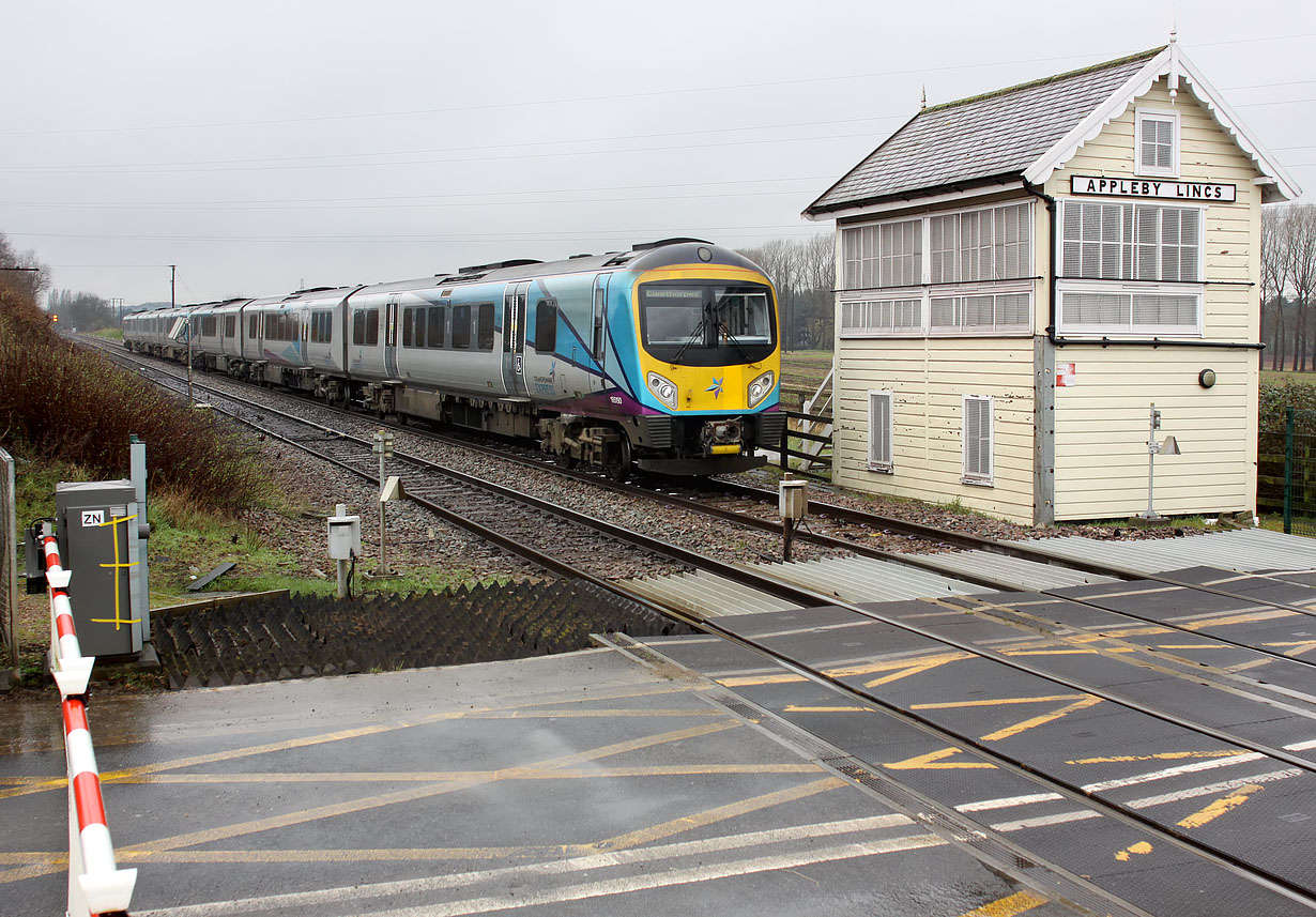 185150 & 185124 pass the Grade II listed Appleby (Lincs) Signal Box on 12 March 2024 with the 1B72 09:19 Liverpool Lime Street to Cleethorpes TransPennine Express service. The signal box was taken out of use in 2015.
