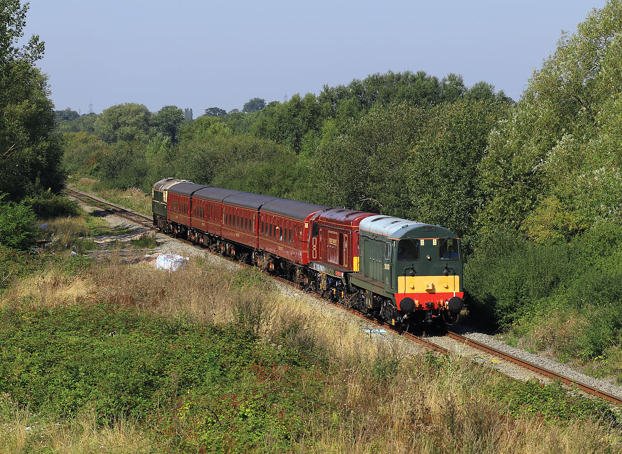 20007 & 20142 Sir John Betjeman pass the site of Waddesdon Manor station on 26 August 2019 with the UK Railtours 1Z34 12:25 Quainton Road to Rickmansworth 'Metroland & Quainton' railtour. The stock is London Underground 4-TC set 8028, and D6515 Lt Jenny Lewis RN is bringing up the rear. |