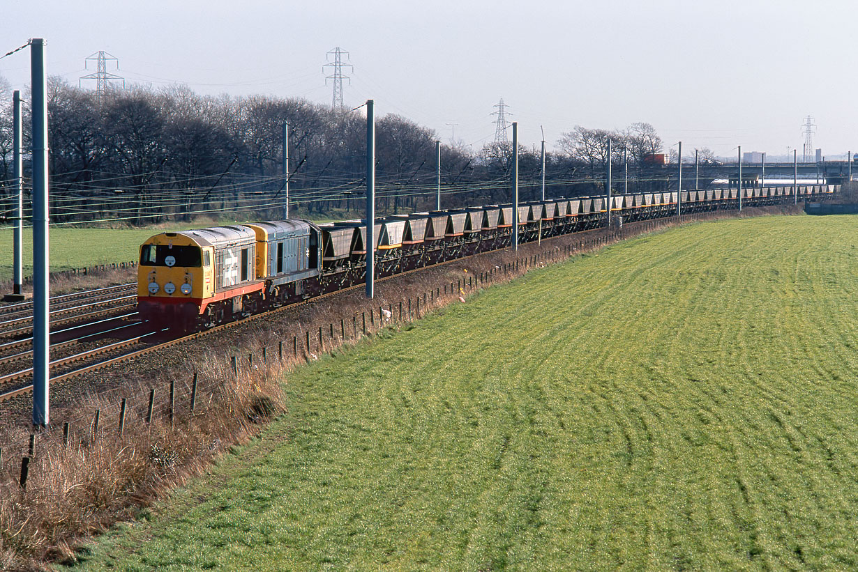20063 & 20071 pass Winwick on 12 March 1990 with MGR empties from Fiddlers Ferry Power Station to Bickershaw Colliery. I would photograph this train later in the day, as it passed underneath the bunker at Bickershaw, where it would receive another load of the black stuff. |