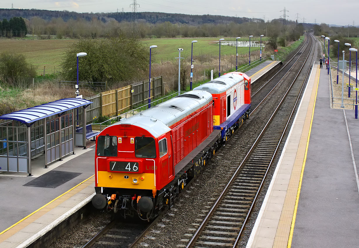 20189 & 20227 pass through Radley station on the very gloomy evening of 19 April 2013 with the 0Z20 12:27 Butterley to West Ruislip light engine move. I have included this going away shot, as it shows the livery variation between the two recently painted locos. 20189 (L189) is wearing the older more restrained London Transport red, whilst 20227 sports the more modern colour scheme. |
