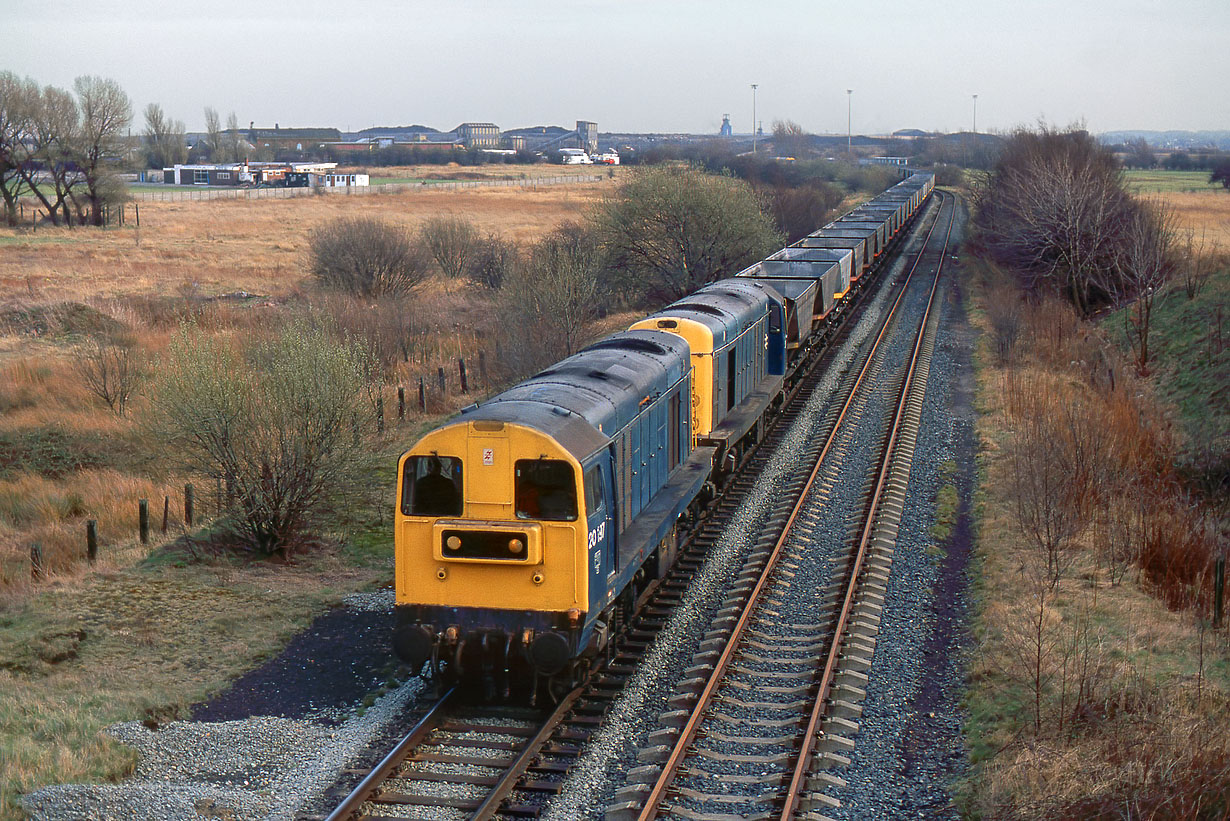 20197 & 20082 bring up the rear of a train of MGR empties from Fiddlers Ferry Power Station, as it approaches Bickershaw Colliery on 12 March 1990. The lead locos (20071 & 20063) are almost at the colliery, but virtually hidden by the bushes in this view. The railway here has now been lifted, and this location is an overgrown jungle of trees. |