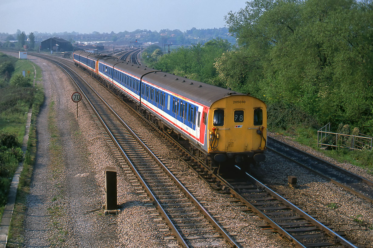 Unusual visitors to the Didcot area on 6 May 1990. 205030 & 205032 head north past Didcot North Junction with the Kingfisher Railtours 06:30 Yeovil Junction to Bescot (for the Open Day) 'Bescot Pioneer' railtour. Coincidentally, it was not the only railtour to pass this spot that morning, as shortly afterwards 43081 headed in the other direction with the Hertfordshire Railtours 07:15 Derby to Paignton 'Torbay Express' tour. |
