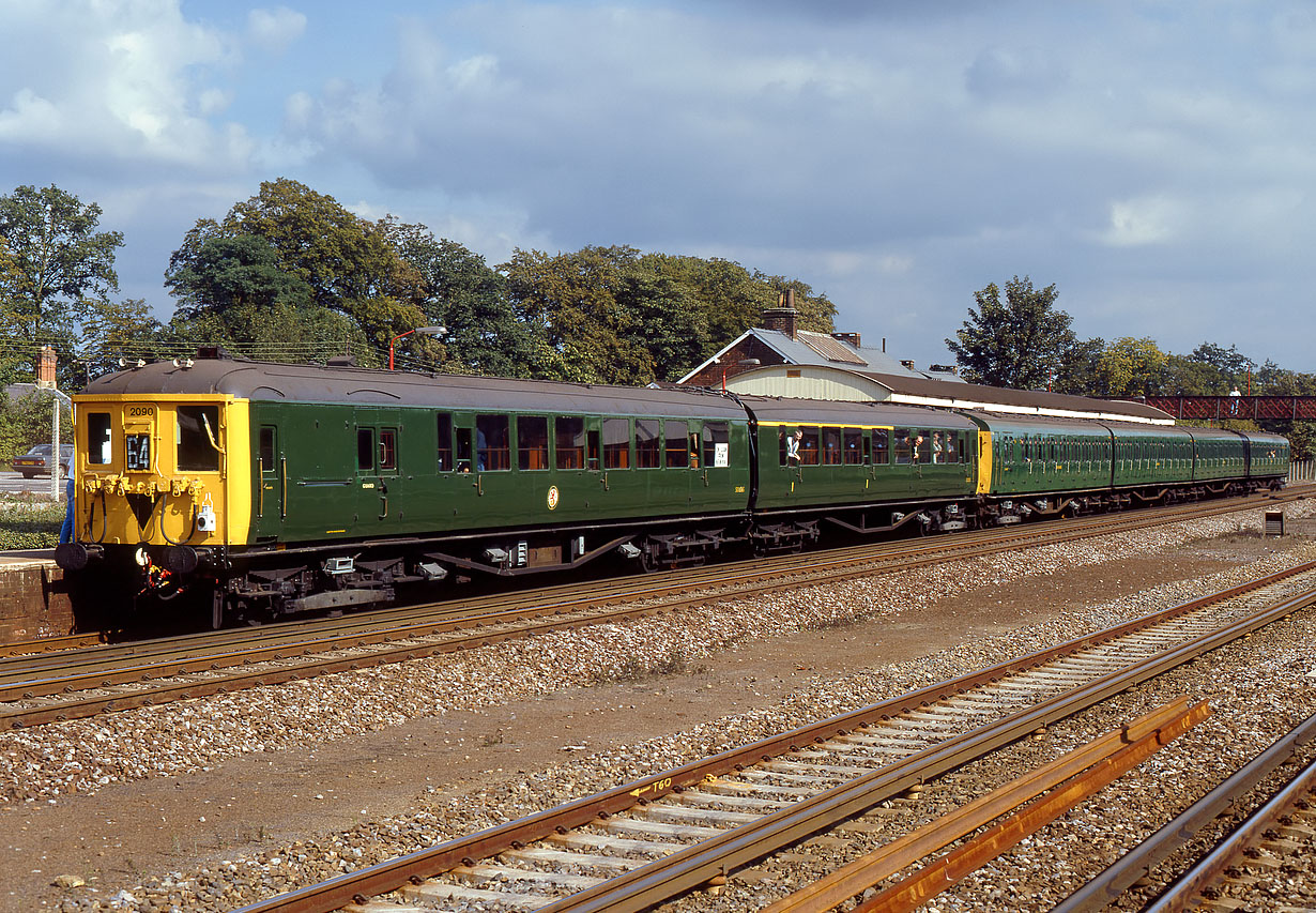 Class 401 2-BIL 2090 brings up the rear of a Basingstoke to Woking shuttle service at Winchfield on 27 September 1987. This was in connection with the Basingstoke Rail Show. Equally historic Class 405 4-SUB 4732 is leading the train. The white notice in the window advertises the fact that the immaculately restored unit is on loan from the National Railway Museum. |