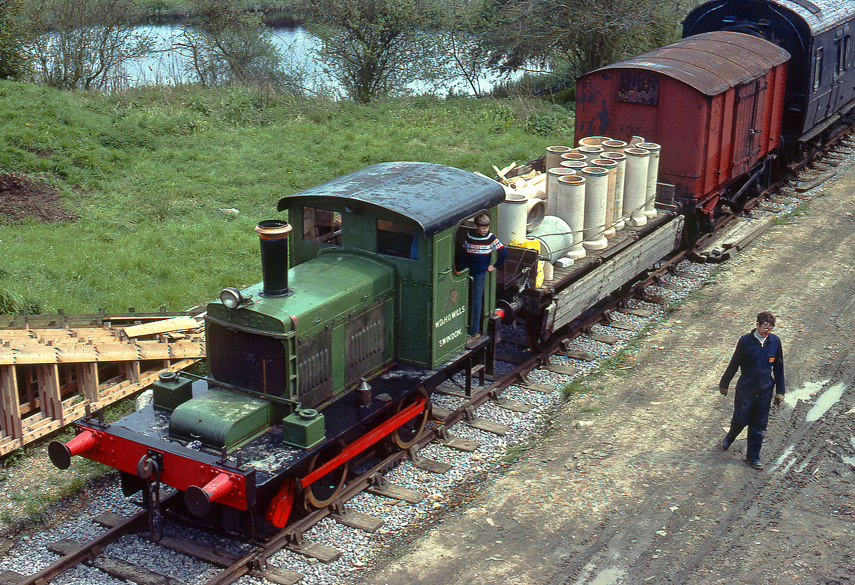 In the very early days of the Swindon & Cricklade Railway, 1936 built John Fowler 0-4-0 No.21442 shunts an engineers train at Blunsdon on 9 May 1981. The loco is still in its unrestored condition, in the original livery of W.D & H.O Wills, in whose Swindon factory it had worked for fifty years. It has since been restored and appropriately in view of its links with the tobacco industry been named Woodbine. Note also the very basic nature of the Blunsdon site at this time, with the general impression in this view from the roadbridge being of a single track line running through a field! |