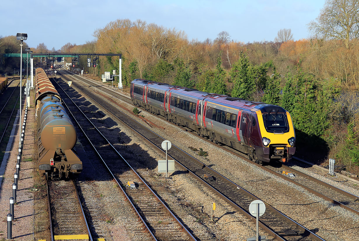 220033 passes Hinksey Yard on 9 December 2019 with the late running 1O84 07:25 Newcastle to Southampton Central CrossCountry service. What makes this picture particularly noteworthy is the Rail Head Treatment Train tanks tacked on the back of the 6M50 07:49 Westbury to Bescot engineers train on the left. The local RHTT season has obviously finished, and the tanks are making their way back up north. As the train was only stopped in this position for a few minutes, after moving forward from the yard after its booked layover, this was a very lucky shot. |
