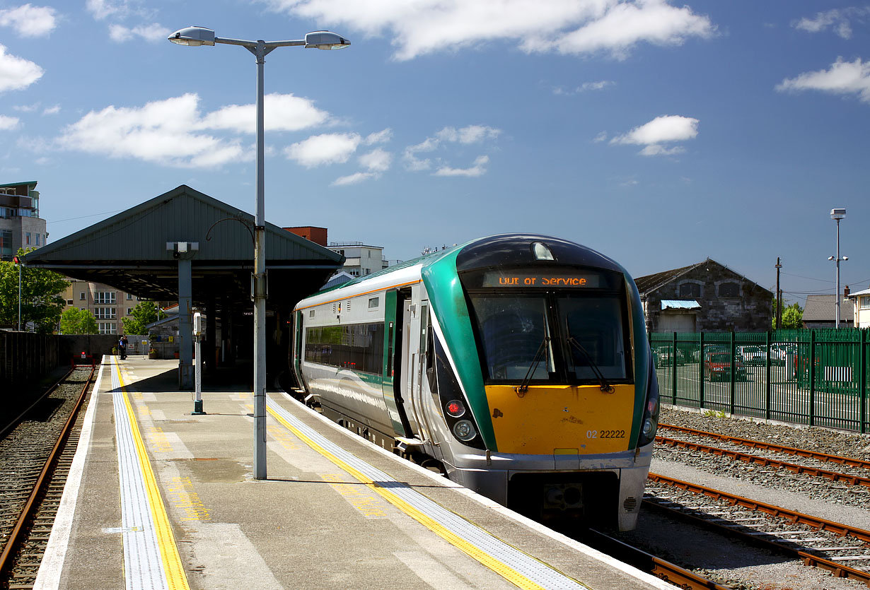 Iarnród Éireann 22000 Class 22022 stands at Tralee station on 22 May 2018. The 'Out of Service' being displayed in the destination window is slightly misleading, as it is in fact just on a seven minute break, between arriving with the 13:20 train from Mallow, and departing with the 15:05 service back to Mallow. Unlike normal practice in the UK, Irish Rail DMUs carry the vehicle number on the front, rather than the set number. Note the old goods shed in the background. |