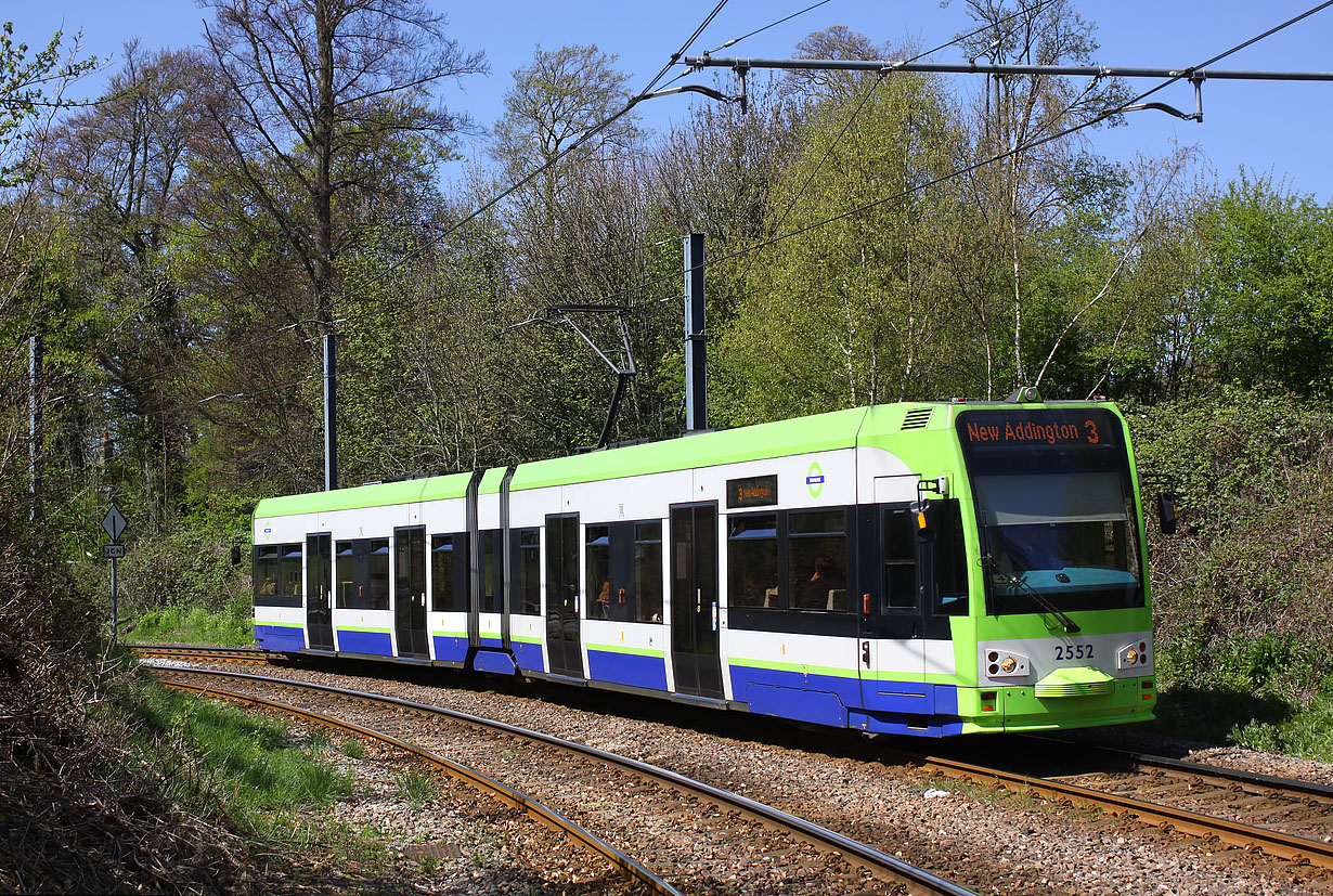 In addition to the typical urban locations, the Croydon Tramlink system has some very rural sections, especially at the southern end of the New Addington line. On 1 May 2013, 2552 rounds the sharp curve near Gravel Hill, at Addington, as it heads for New Addington with the 12:22 from Wimbledon. |