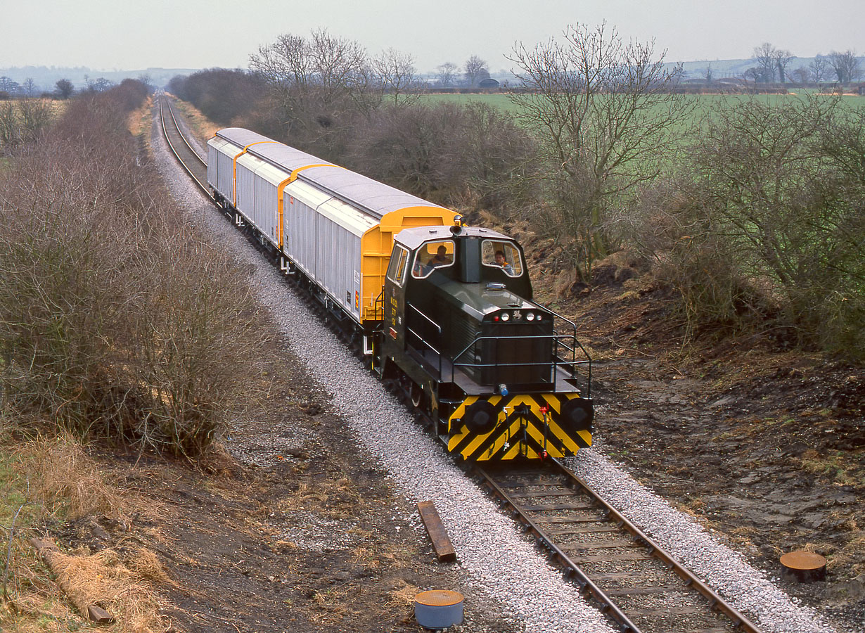Thomas Hill 0-4-0 Army loco 277 Kineton trundles along the Army's Fenny Compton to Kineton line near Knightcote on 24 February 1992 with three immaculate VGA wagons of military stores. The wagons had been tripped up to Fenny Compton on the 6M19 07:45 Didcot to Fenny Compton, behind 47309. |