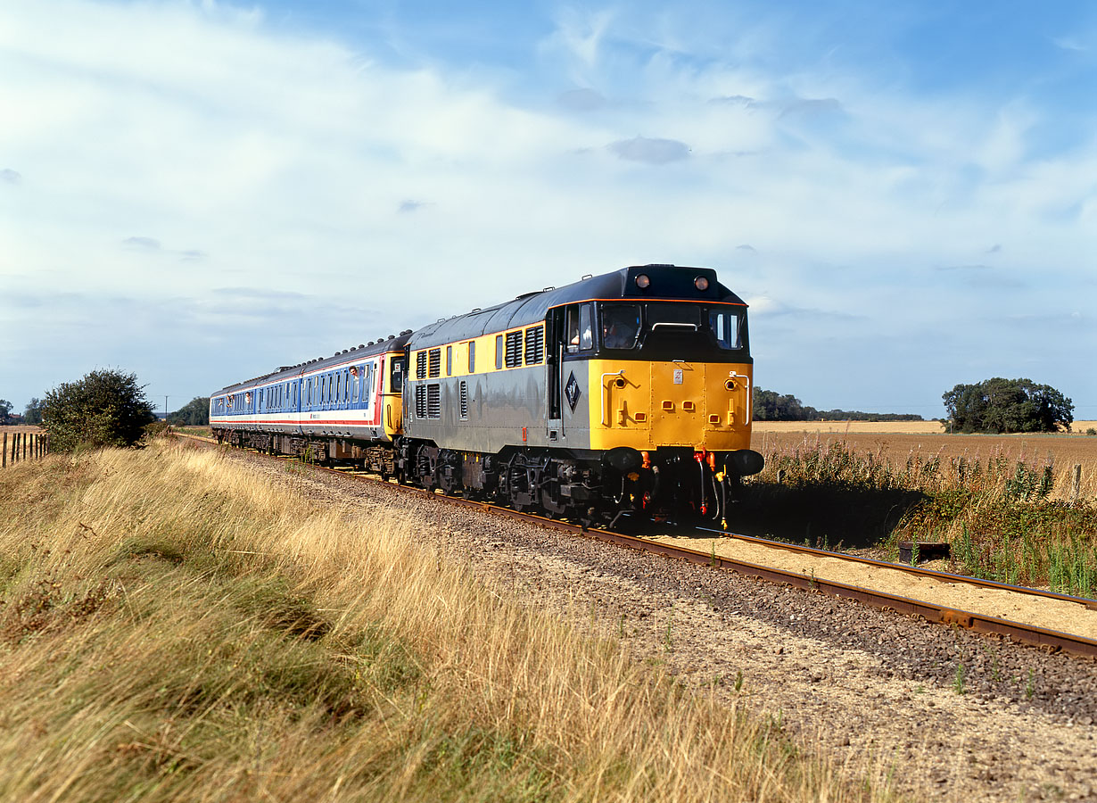 31135 slows to a crawl so that a member of the train crew can open the level crossing gates at Histon on 14 September 1991. The train is returning from Fen Drayton to Cambridge, during the Network Gala Day. Bizarrely the stock is 25kV EMU 312787. The neat line of sand deposited in the 'four foot' clearly indicates why this rural byway was kept open. Sadly it was not to last much longer, closing the following year. After lying abandoned for years, it is, a I type this (December 2010) just about to open as a guided busway - a remarkable and slightly dubious transition. |