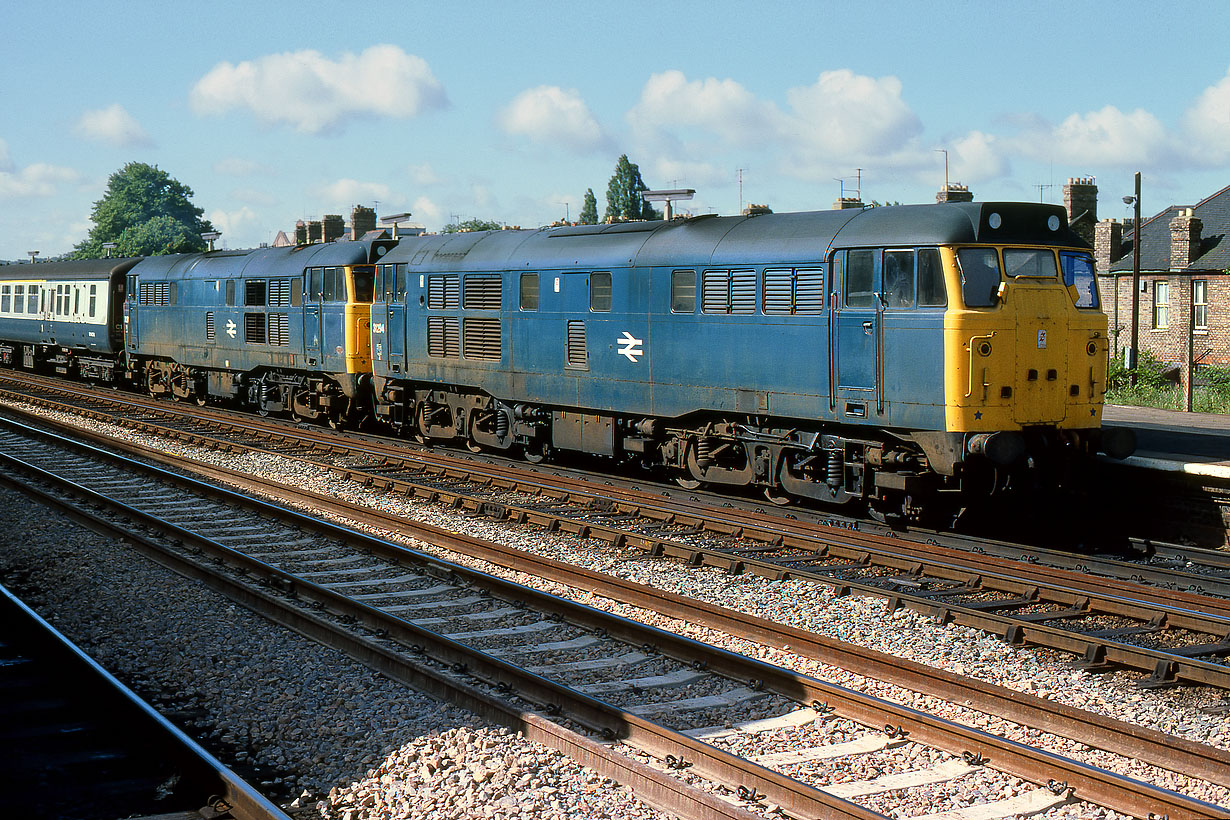 I have a few pictures of Class 31s on the Cotswold Line, but not of a double headed passenger train. However, if I had been in a different place on 5 July 1980, I could have got one. Instead, I was at Oxford station when most unexpectedly 31294 & 31231 rolled in with the 1B30 08:00 Paddington to Worcester Shrub Hill service. Unfortunately the sun was behind a cloud as it entered the station, so I had to make do with the close up view as it waits at the end of platform 2. |