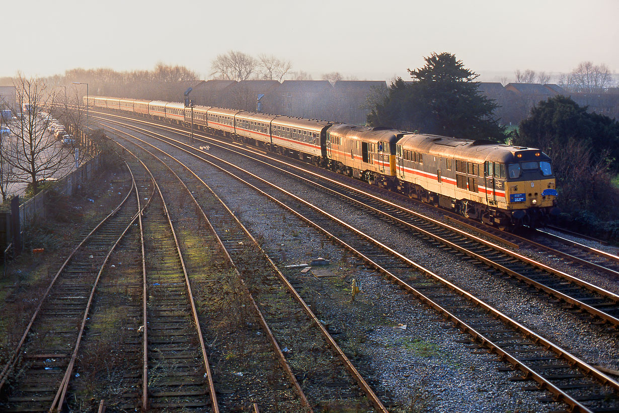 A golden early morning glint at Oxford on 20 January 1996, as 31420 & 31423 Jerome K. Jerome round the curve on the approach to the station with the Hertfordshire Railtours 1Z31 08:03 Paddington to Stafford 'Soho Sinner' railtour. 47226 was added to the rear of the train at Stourbridge Junction, in order to work the train in top'n'tail mode around various Birmingham lines, which to justify the tour's name included passing Soho North and East Junctions. |