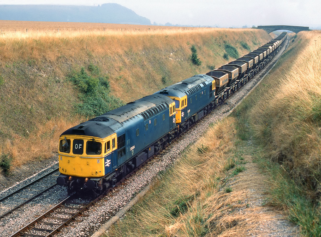 33034 & 33028 roll down the gradient at Upton Scudamore on 16 August 1984 with the 6V17 10:00 Allington to Westbury ARC stone empties. This was one of the very few occasions that I managed to photograph Class 33s working a stone train.