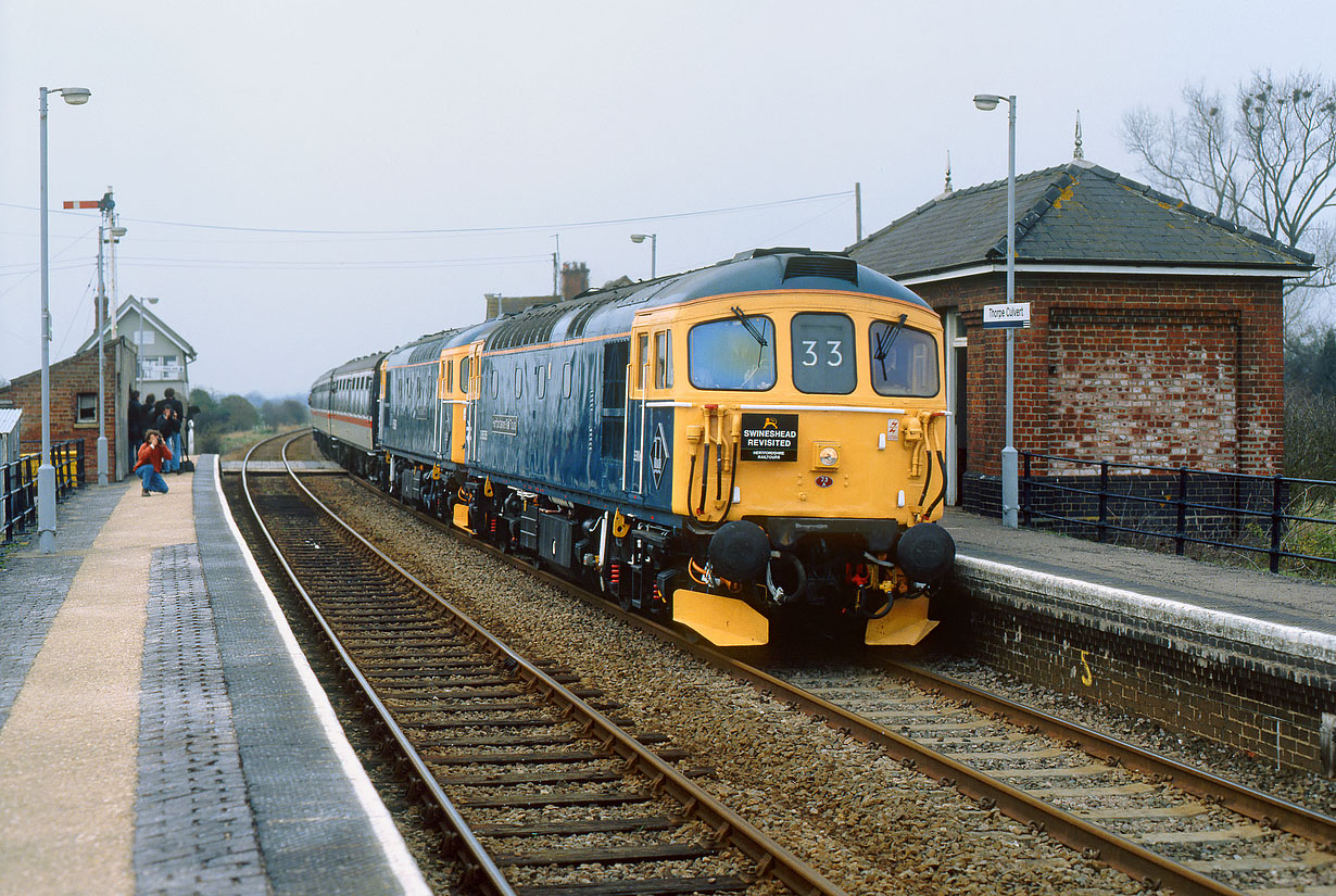 33116 Hertfordshire Railtours & 33051 Shakespeare Cliff pass through Thorpe Culvert station on 22 March 1997 with the Hertfordshire Railtours 1Z33 08:33 Kings Cross to Skegness 'Swineshead Revisited' railtour. The station is situated in the flat Lincolnshire landscape, with only a few farms and scattered houses in the vicinity. |
