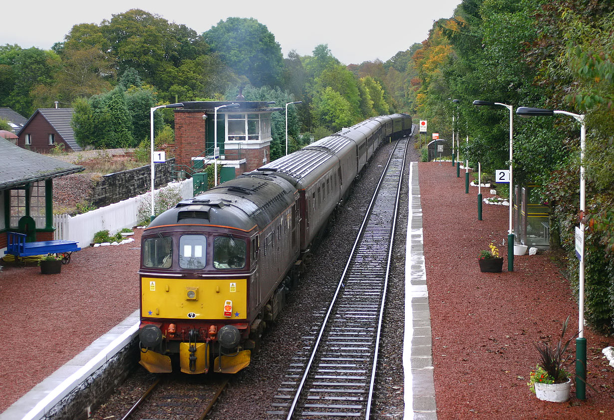 The Royal Scotsman 5H86 13:47 Fort William to Spean Bridge ECS reverses into platform 1 at Spean Bridge on 6 October 2007, with 33207 leading, but being pushed from the rear by 47787, which had worked the train from Fort William.