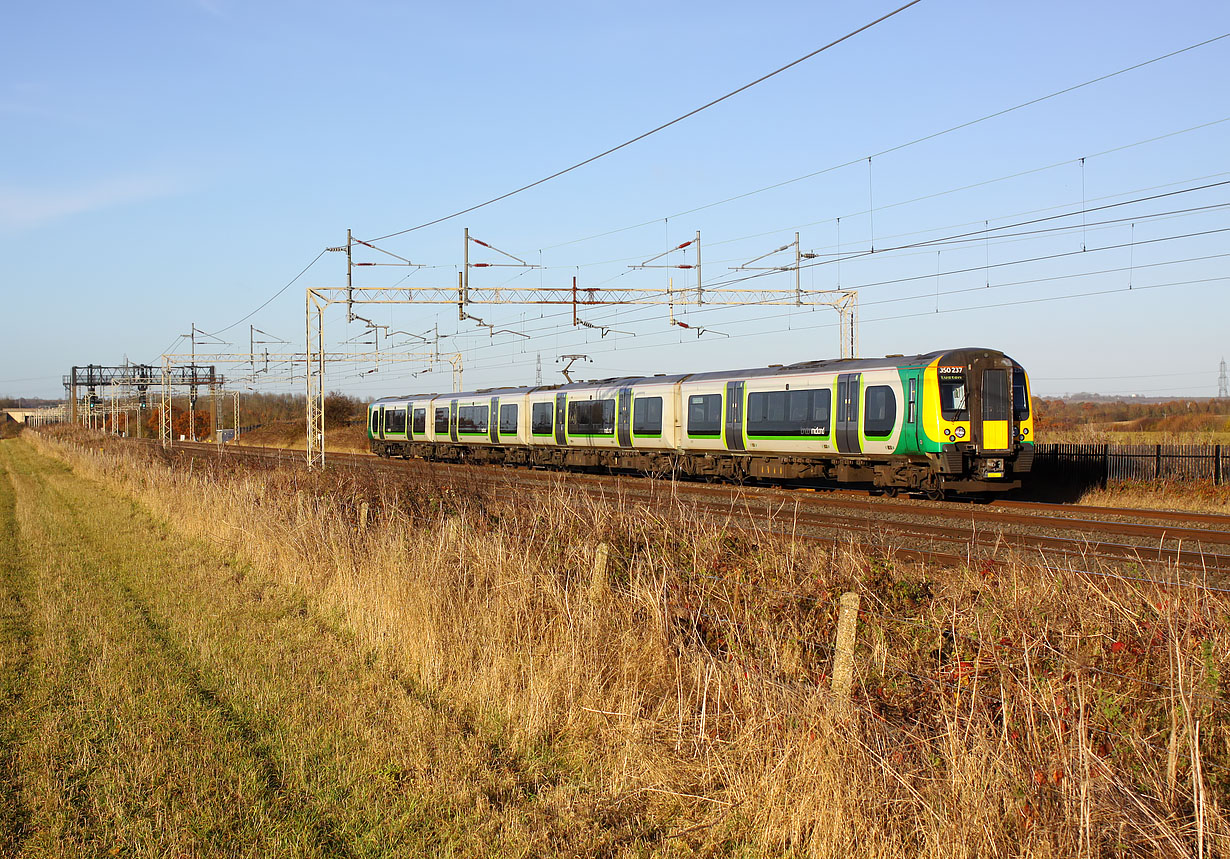 350237 passes Ledburn on 25 November 2016 with the 2K30 13:47 Milton Keynes Central to Euston London Midland service. Just visible in the background is the concrete bridge carrying the recently constructed A4146 Leighton Buzzard bypass over the railway. |