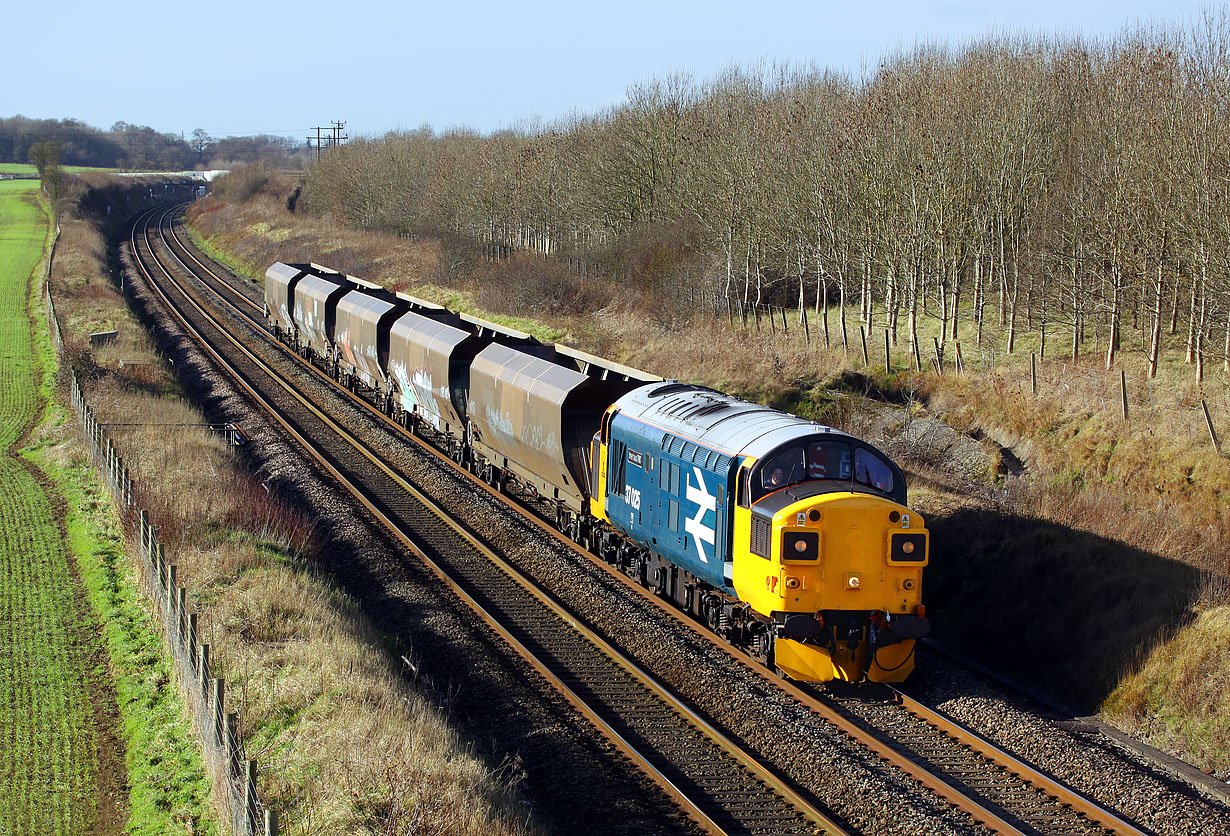 37025 Inverness TMD passes Farleaze (near Hullavington) on 28 January 2016 with the 4B20 09:10 Barry to Barry (via Swindon) Colas driver training special. A large logo split box Class 37 on the mainline in 2016 with five bogie coal hoppers, who would have predicted that! I was really surprised to be on my own at this location. Admittedly the sun is not on the nose, but that applies to a lot of the locations to the east of the River Severn. It is however shadow free, with an uncluttered background. |