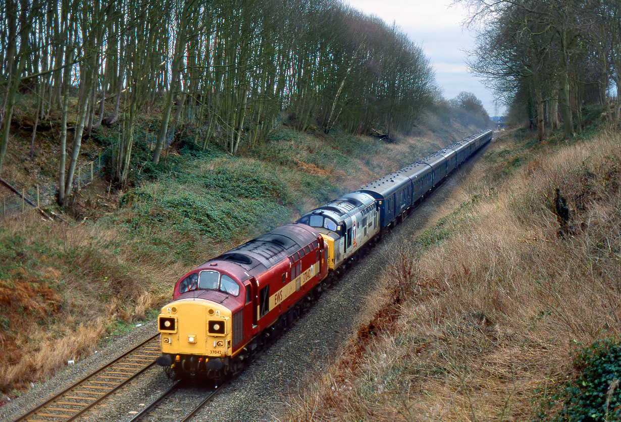 37042 & 37410 Aluminium 100 pass Codsall Wood (between Wolverhampton and Telford) with the Hertfordshire Railtours 1Z37 06:00 Finsbury Park to Aberystwyth 'Cambrian Explorer' railtour on 8 February 2003. Participants could leave the train at Machynlleth, and travel to the Talyllyn Railway by bus, where they joined trains hauled by either Sir Haydn or Tom Rolt. |
