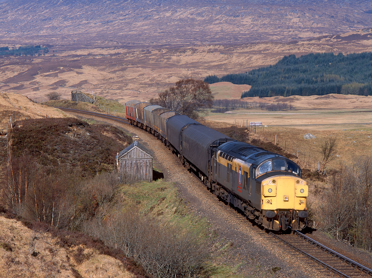 37043 passes a long since disused permanent way hut and the remains of a former footbridge as it passes Achallader on the West Highland Line with the 6Y45 06:36 Mossend to Fort William Enterprise service on 28 April 1998. For once it was a pleasant wait in the sunshine at this remote spot as the infamous Scottish midges that become unbearable later in the summer had yet to make an appearance. Also at this time of year the landscape shows a varied mixture of colours from green through brown almost to purple. |