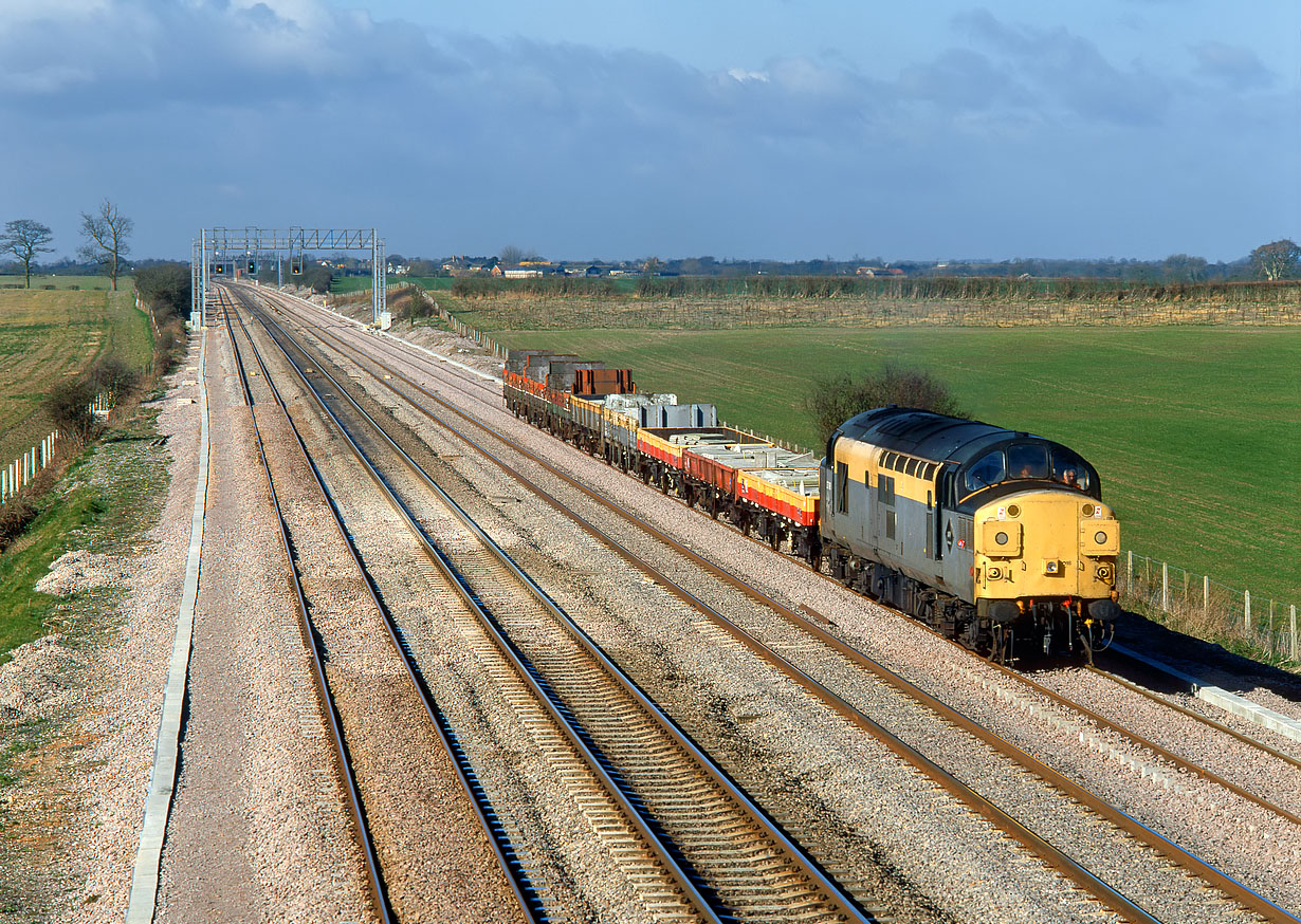 37098 ambles along the as yet to be commissioned new up relief line at Denchworth (Circourt Bridge) on 16 March 1994 with a short engineers train. On the left, the new down relief line is already in use. Note the recently planted trees at the far end of the field behind the train. These have subsequently grown into a fully fledged wood, blocking out the view of the buildings in the background. |