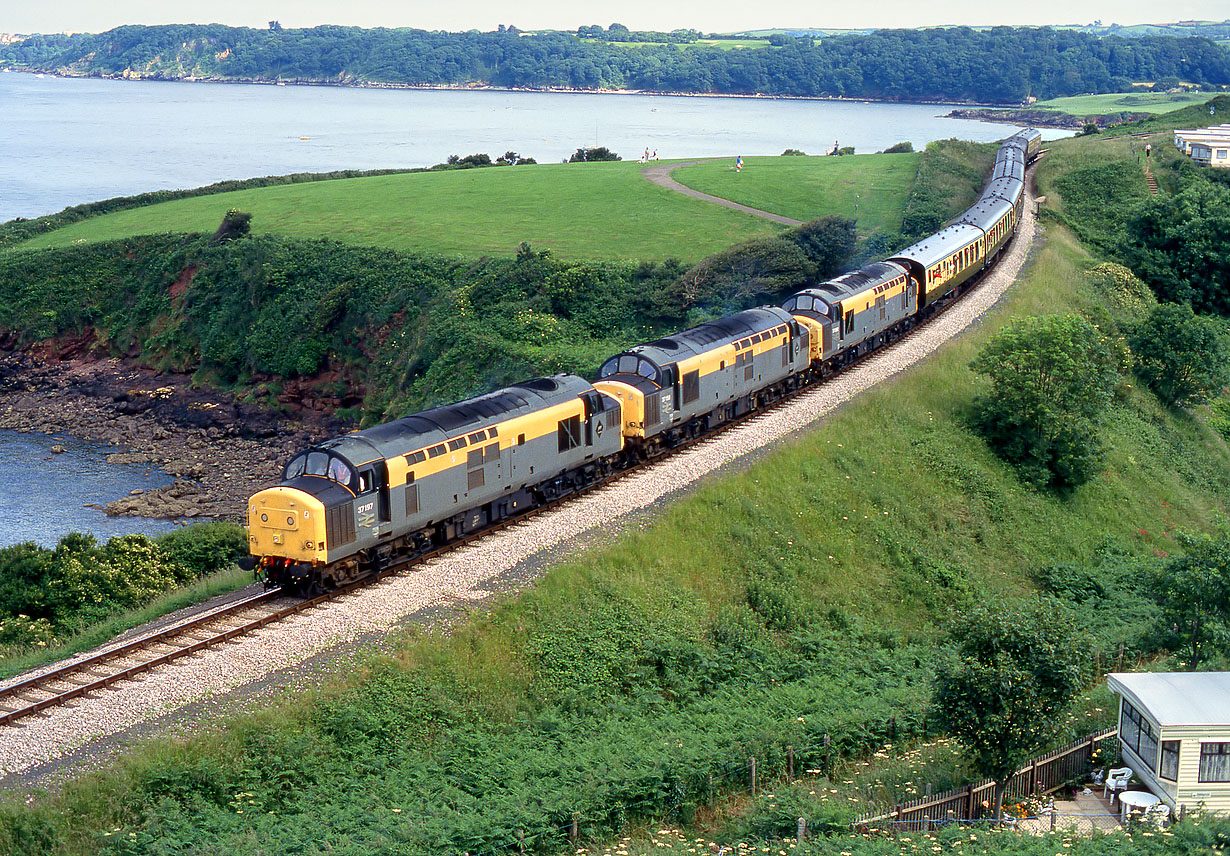 37197, 37158 & 37092 pass Waterside, near Goodrington, on 20 June 1993, en-route from Kingswear to Paignton, during the Paignton & Kingswear Railway's Diesel Gala. The Dutch liveried trio would then return to London with the 1Z60 17:40 Paignton to Paddington relief. This was in the days when the nationalised railway had the resources to arrange short notice special trains. |