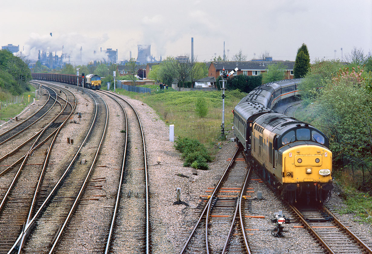 After traversing the East Usk branch, 37230 arrives back at East Usk Junction on 19 April 1997 with the Pathfinder Tours 1Z63 'Welsh Wizard' railtour. 37254 is out of sight around the corner on the rear of the train. 59102 Village of Chantry waits in the background with the 6B40 11:50 Llanwern to Port Talbot iron ore empties. |