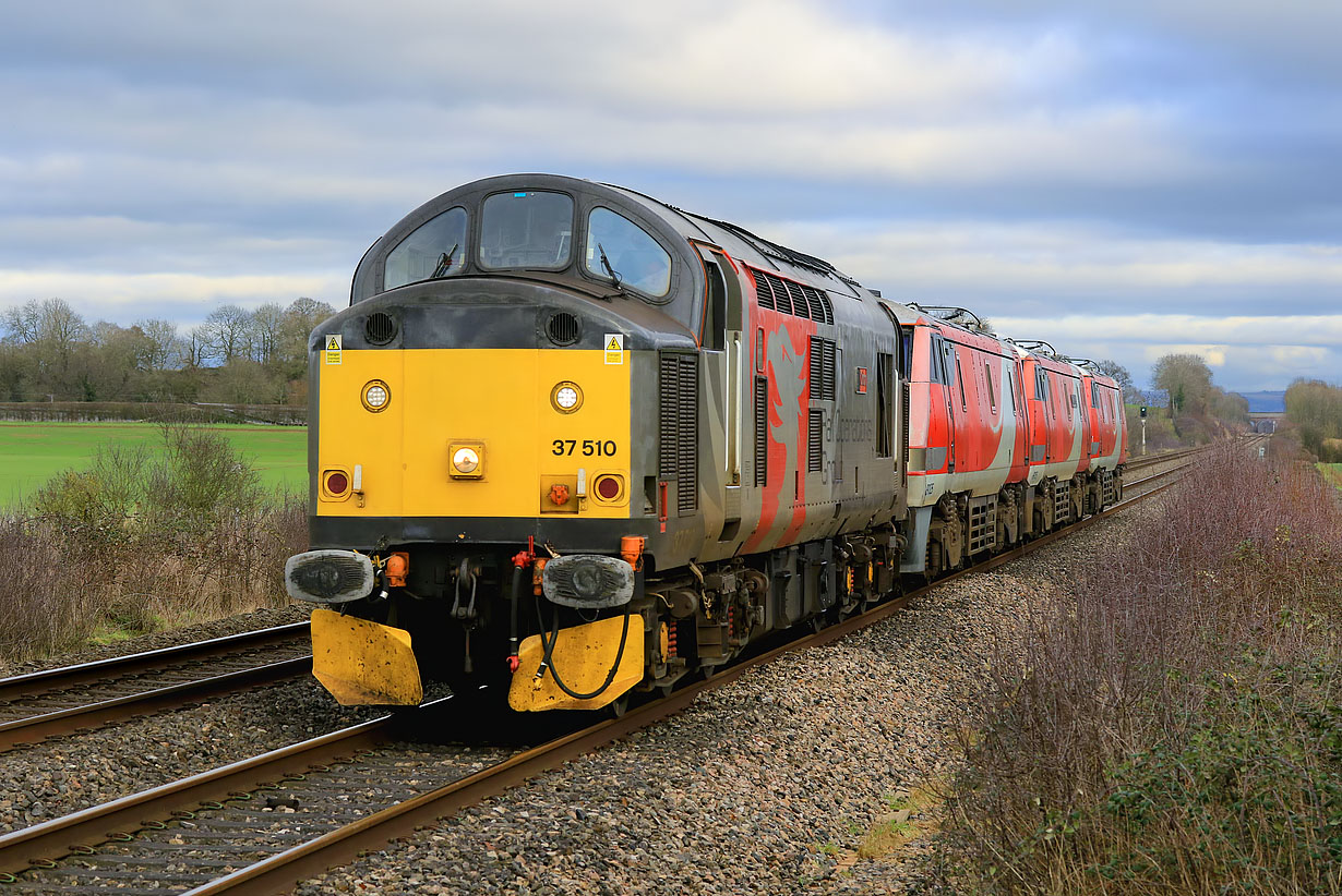 37510 Orion passes Minsterworth on 3 February 2023 with the 7Q78 08:40 Doncaster Belmont Down Yard to Newport Docks (Sims Group), conveying electric locos 91125, 91115 Blaydon Races & 91112 for scrap. This was running an hour early, as nationwide rail strike action meant that there was little to get in its way, so it gradually got ahead of time, despite its 45mph speed limit. I went to this location not because it is a particular scenic spot, but because it allows an uninterrupted view of the rear of the train. After all, Class 91s are much rarer than Class 37s in Gloucestershire! |