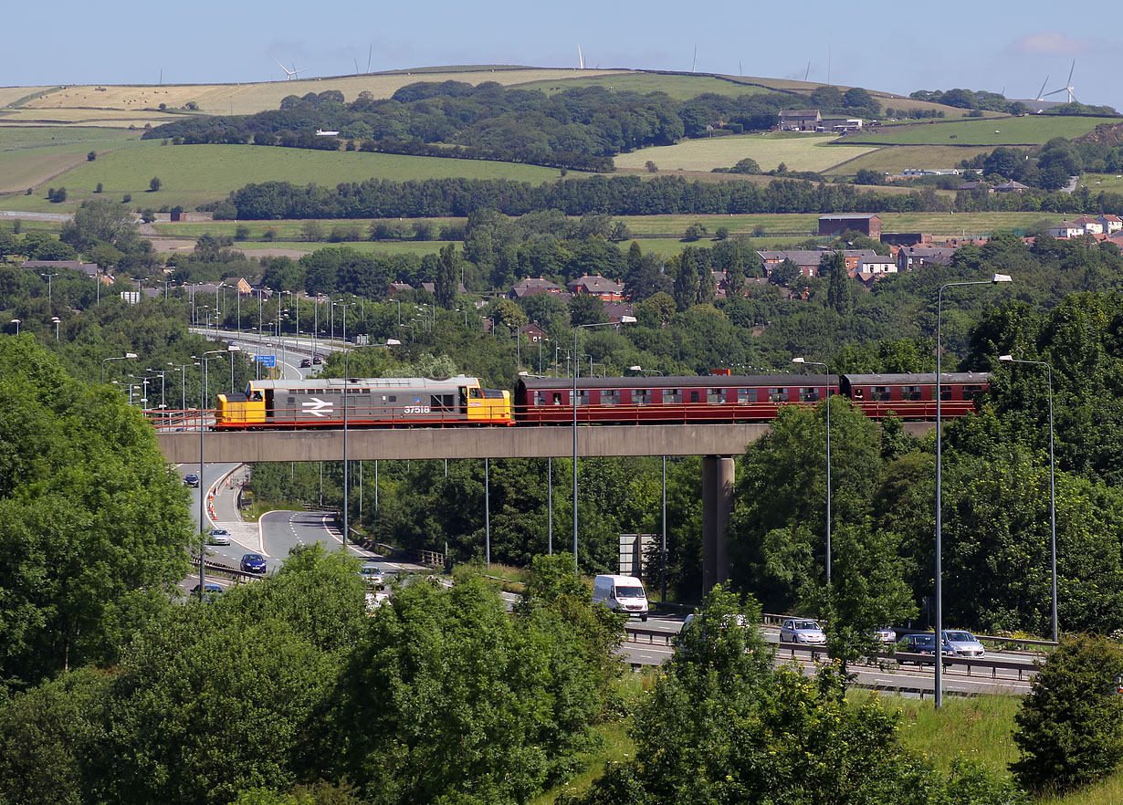 37518 crosses the M66 motorway at Heap Bridge on 3 July 2011 as it works the 2J71 11:15 Heywood to Rawtenstall service, during the East Lancashire Railway's Diesel Gala. Although this was only a last minute decision to take this picture, I think the composition works really well. The unexpected sight of a Class 37 above the road traffic makes for an interesting picture, although a few less lamp posts in the foreground would have improved things! |