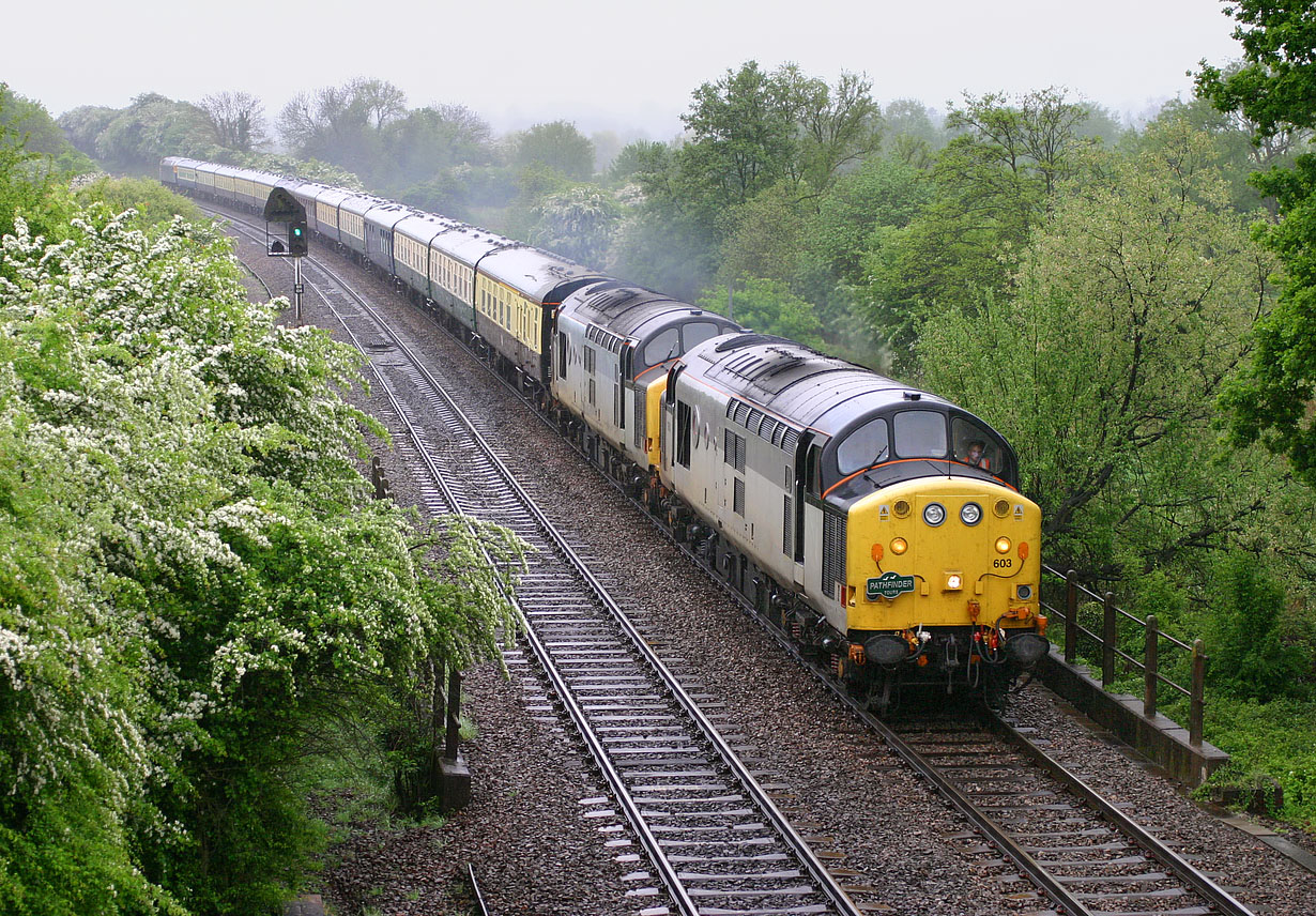 37603 & 37604 pass Aynho Junction in the rain with the Pathfinder Tours 1Z37 05:26 Southampton to York 'Ouse-Humberman' railtour on 7 May 2007. 47805 Talisman, which had headed the tour as far as Didcot, can just be seen on the rear of the train. The signal on the left controls Aynho Junction, where the line to Marylebone via Bicester diverges from the Oxford line. |