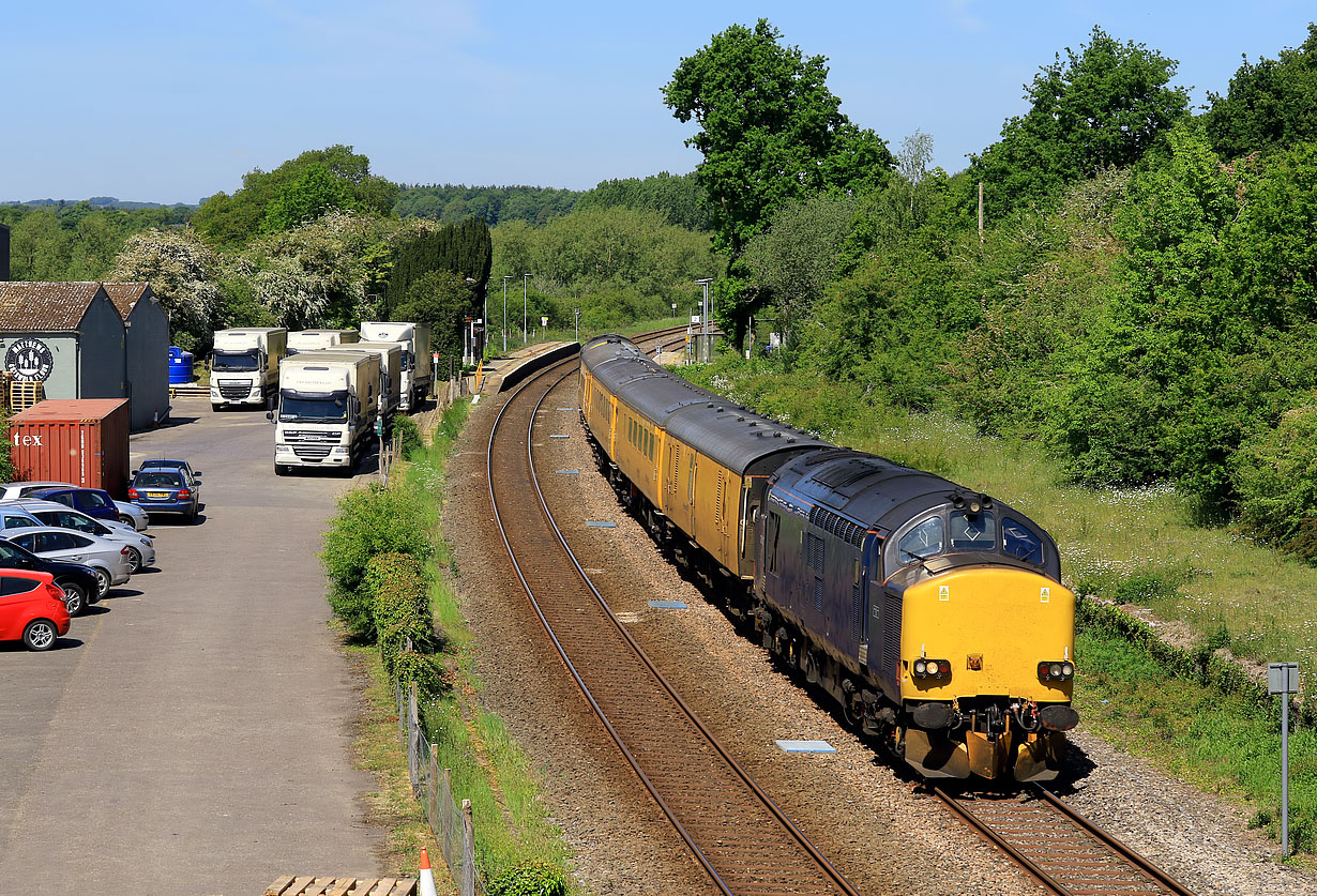37612 passes through Shipton station on 20 May 2020 with the 1Z22 08:20 Tyseley to Bristol High Level Siding Network Rail test train. Harsh overhead midday lighting, but a Class 37 on the Cotswold Line is always worth photographing. The round sign on the building on the left proclaims 'Matthews Cotswold Flour'. The Edwardian mill building is just off to the left of the picture. |