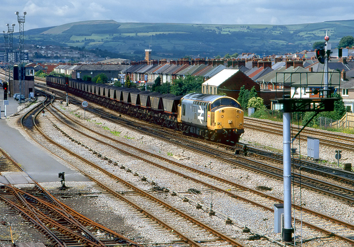 The Class 37/7 sub-class was created in 1986, with modifications similar to the 37/5s, but with the addition of ballast weights to increase tractive effort. 37701 emerged in its new guise in November of that year. Initially the refurbished locos were repainted in the then current Railfreight grey colour scheme. 37701 is pictured heading for Llanwern with a loaded MGR on 2 July 1990, passing a vintage GWR semaphore signal at East Usk Junction, Newport. |
