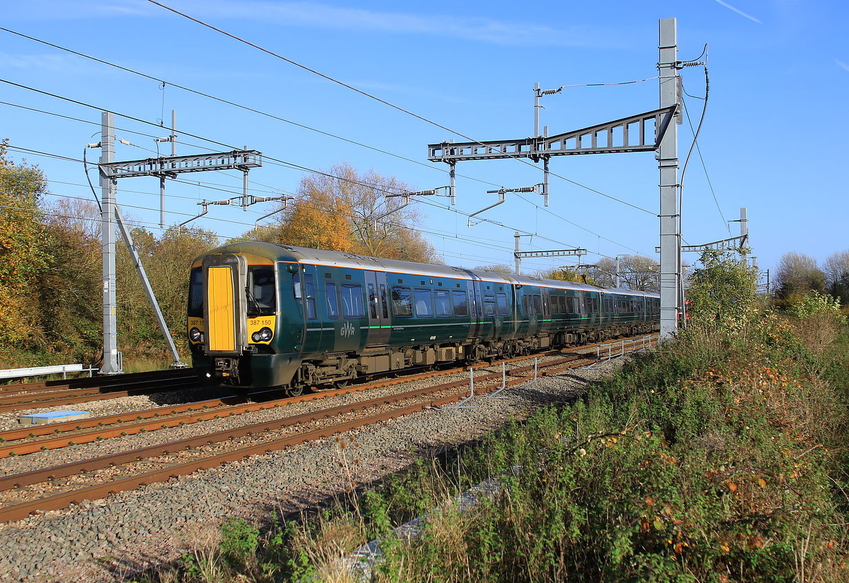 Yet again I have photographed 387150, with a more colourful hired in Gatwick Express unit on the back! The red livery of 387206 can just be glimpsed through bushes, as the 9U54 12:12 Paddington to Bristol Parkway GWR service speeds past Grove on 17 November 2021. |