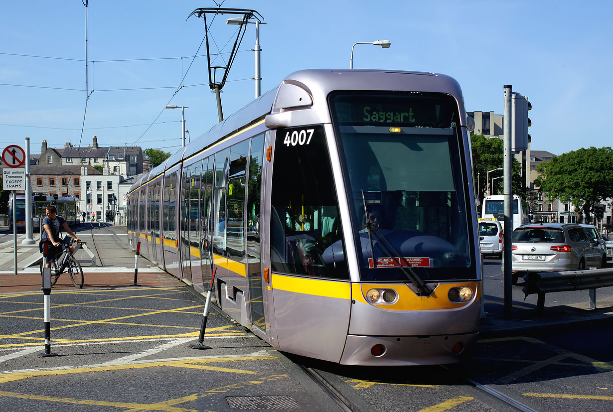 Dublin Luas tram 4007 pulls away from the Heuston tram stop, and crosses St John's Road, West, with a service for Saggart on 23 May 2018. The box junction in the foreground was not being correctly observed, even by some buses!