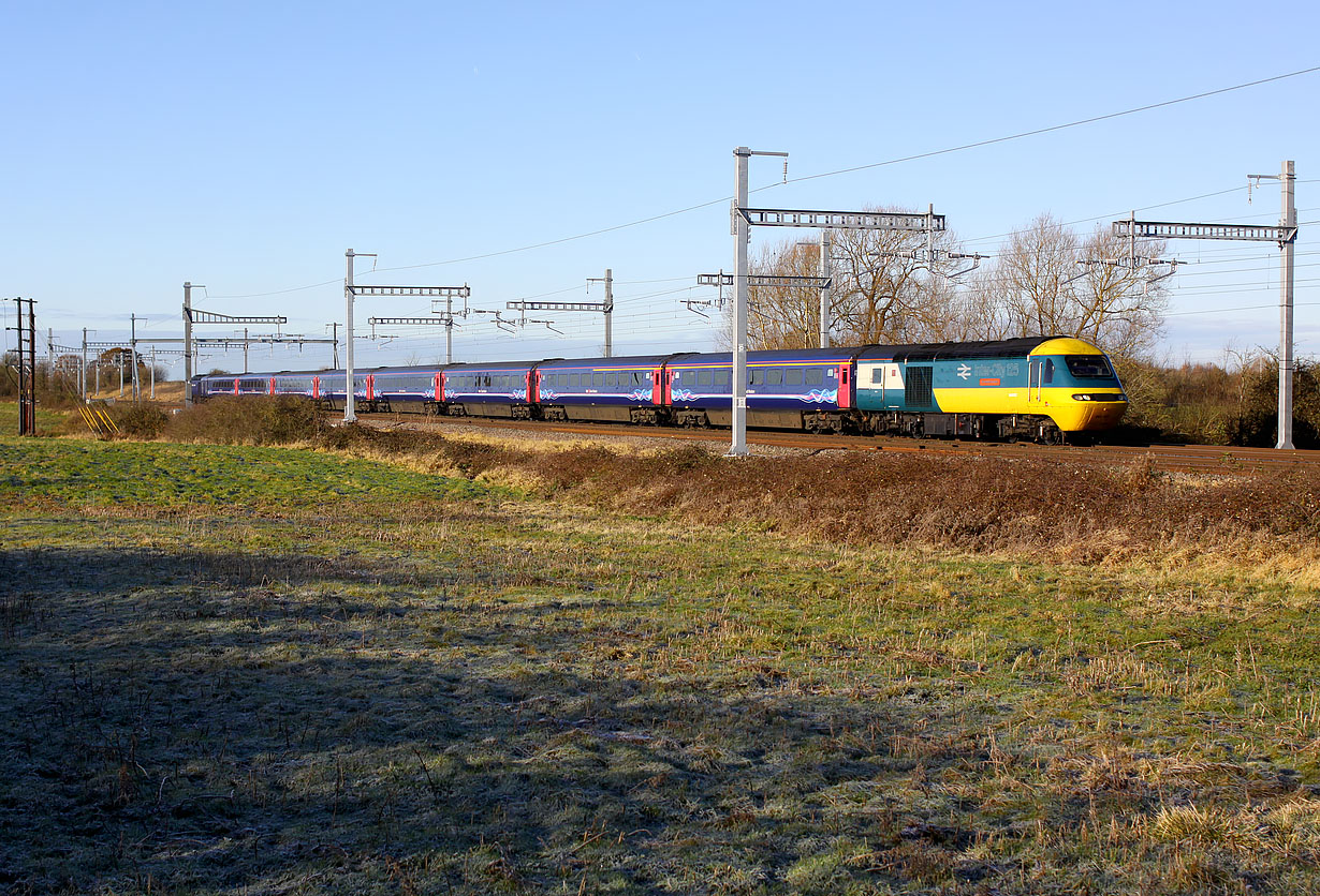 43002 Sir Kenneth Grange passes Grove on 30 November 2017 with the 1L38 07:59 Swansea to Paddington GWR service. Strange as it seems, this location has actually got marginally more photogenic since the electfrication wires went up! Before the wires were installed, a high voltage electricity line crossed the railway here. It now goes underground, from the post seen on the extreme left of the picture. Whereas the catenary is a necessary eyesore on an electrified railway, the high voltage wires in an otherwise open landscape completely ruined the picture. |