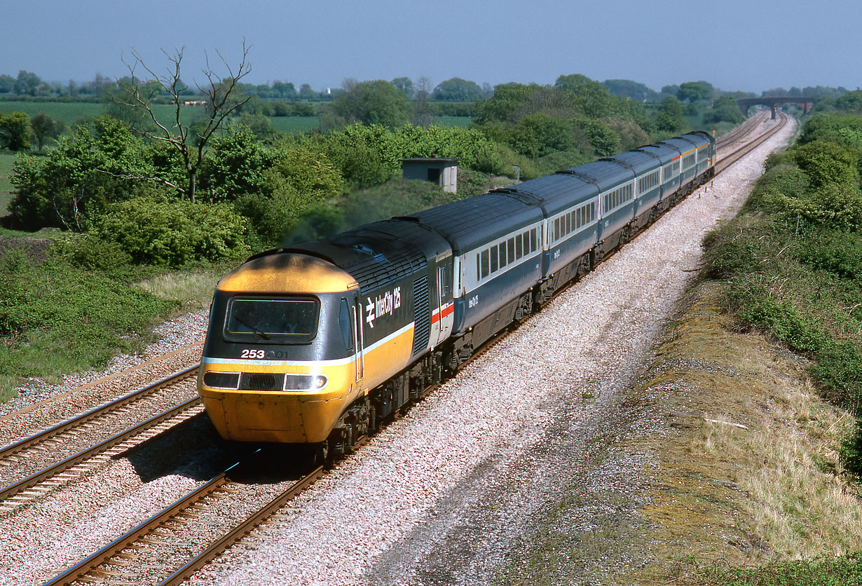 43003 leads the 1B30 13:00 Paddington to Swansea service past Circourt Bridge, Denchworth on 8 May 1987. It seems to be loosing its former set number 253001 piecemeal, with just the 253 left on the front end. By this time they had long since been regarded as locomotives, and were no longer kept in their original sets. In fact, I had seen 253001's former partner (43002) heading in the same direction on a another train approximately an hour earlier. |
