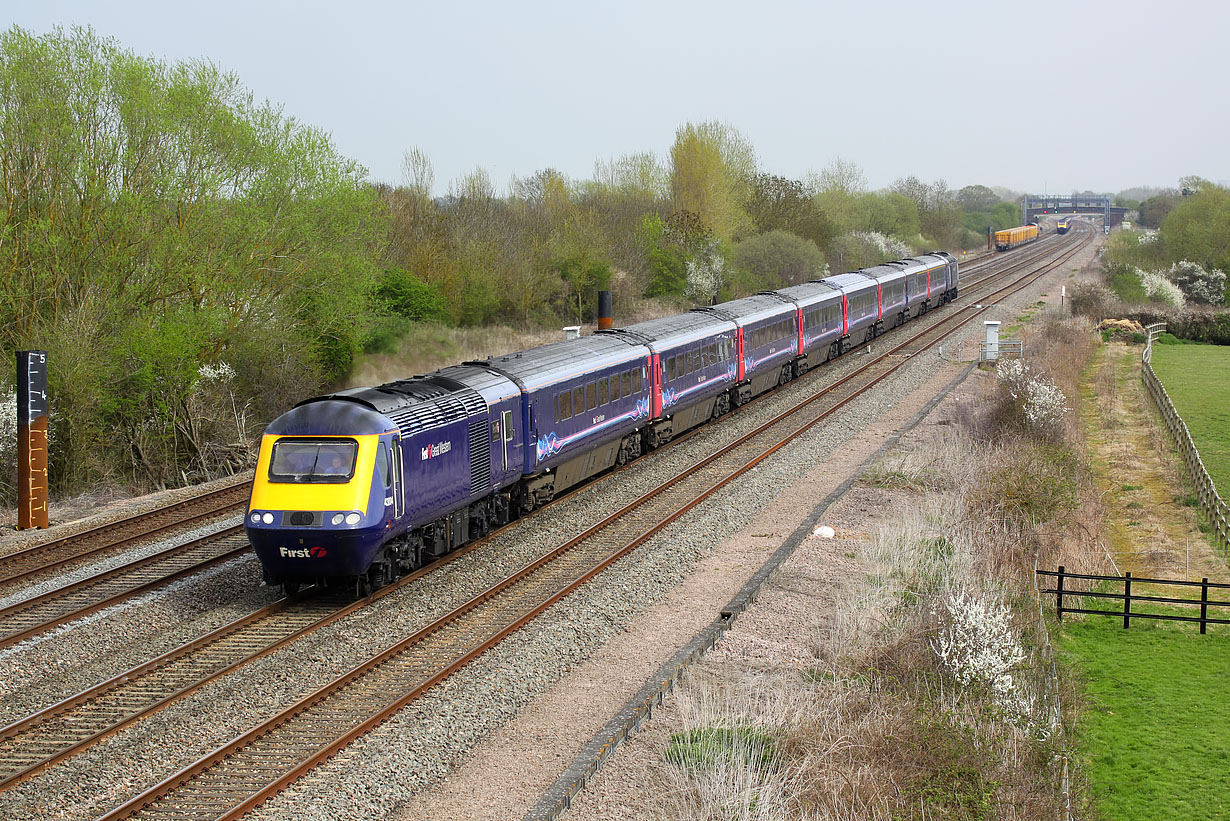 A busy moment at Circourt Bridge, Denchworth, on 16 April 2015. 43004 First for the future / First ar gyfer y dyfodol heads west with the 1C14 12:30 Paddington to Bristol Temple Meads First Great Western service, while the balancing 1A17 12:30 Bristol Temple Meads to Paddington recedes into the distance. Stopped on the relief line is 66729 Derby County with the late running 6M40 11:56 Westbury to Stud Farm ballast empties. Note the red, green, and amber aspects on the signals by the bridge in the background. |