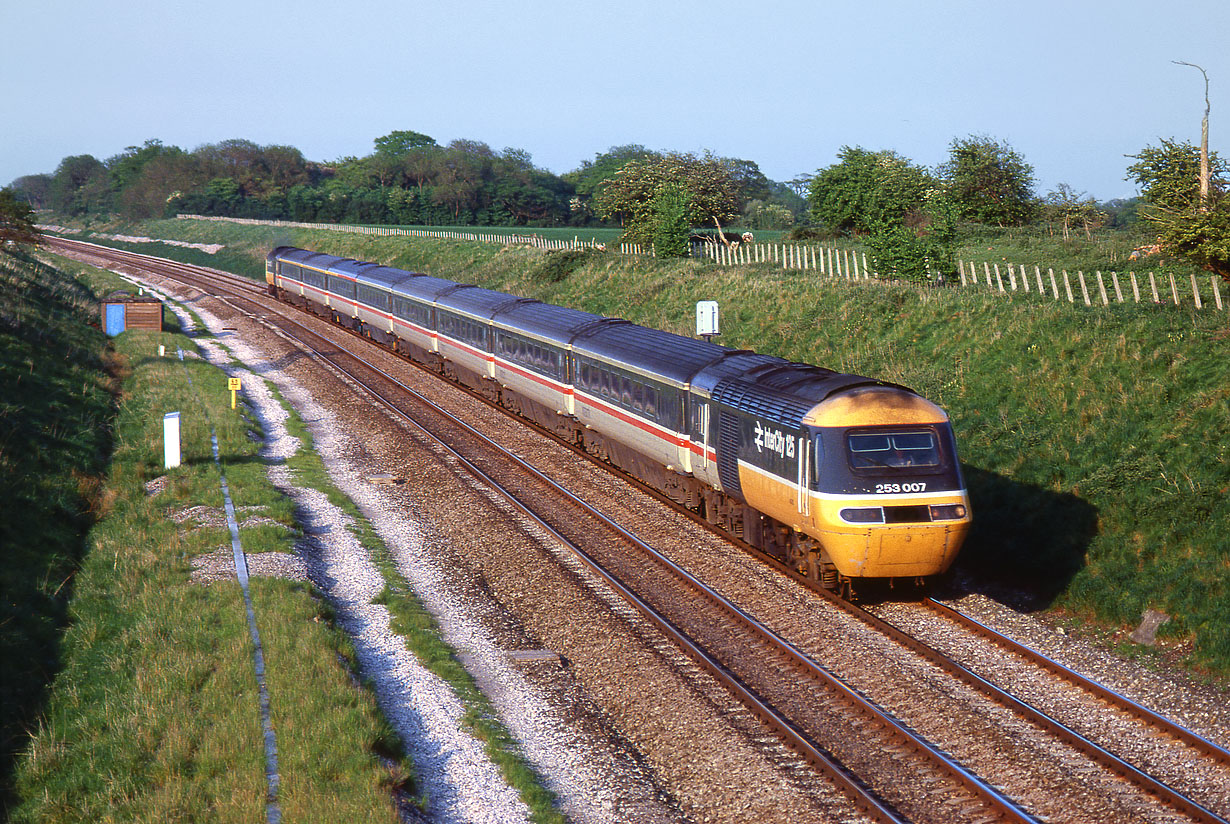 43015 passes Compton Beauchamp on 16 May 1988 with the 1C68 18:05 Paddington to Taunton service. Note the lack of any exhaust or heat haze above the leading power car. This is because it was not working, and the train was being pushed from the rear by the back power car. I thought something was amiss when I realised that it wasn't approaching at the usual 125mph. I have only seen HSTs running on a single power car on a few occasions, and mostly it seemed to be the rear power car that had shut down. No doubt nowadays this train would just have been cancelled! |