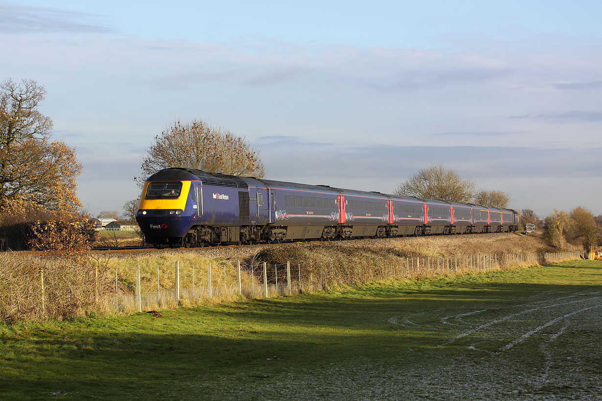 With Baulking Grange Farm just visible through the gap in the trees, 43021 David Austin - Cartoonist approaches Baulking on 9 December 2010 with the 1C14 12:30 Paddington to Bristol Temple Meads First Great Western service.