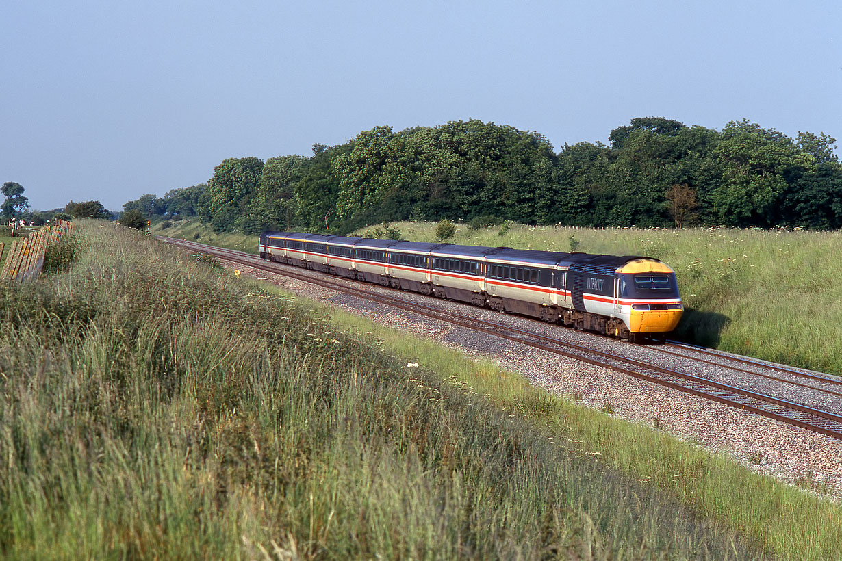 High summer on the Great Western Mainline at Compton Beauchamp. 43022 speeds westwards on 25 June 1996 with the 1B56 18:03 Paddington to Cheltenham service. During mid summer the sun has travelled round so far by the late evening that it is possible to take perfectly lit pictures of trains from the north side of the line at this point. |