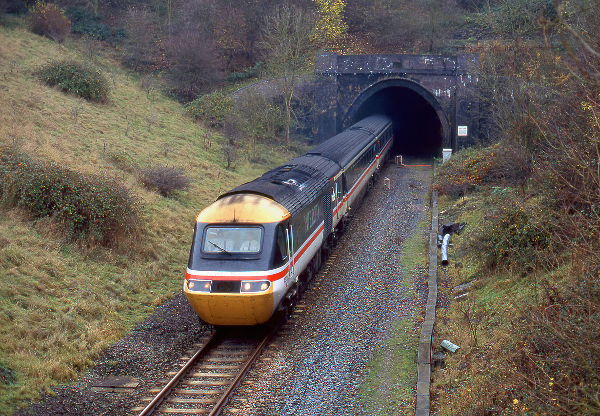 43034 The Black Horse emerges from Ardley Tunnel on 5 November 1994 with the Chiltern Railways 08:10 Paddington to Chester '125 Awayday' railtour, with 43042 still deep inside the tunnel on the rear. HSTs were (and still are) very scarce on the Chiltern Line, and it is ironic that nearly sixteen years later I was back at the same location for another rare visit of the class. Incidentally, in 1994 there was obviously more spare capacity in the HST fleet, as there was another railtour running on this day - the Hertfordshire Railtours 'Coast to Coast', using 43063 & 43076. |