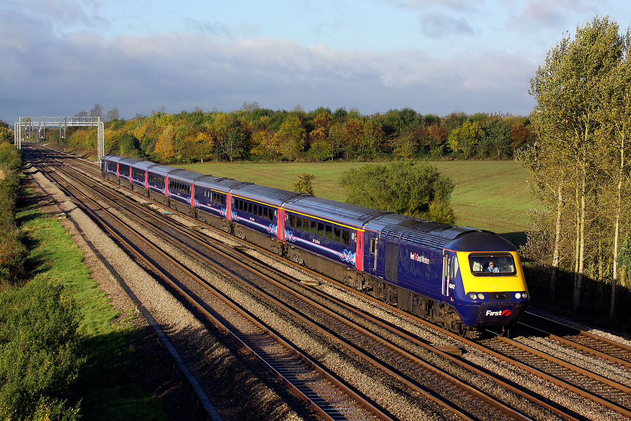 Superb autumnal lighting at Circourt Bridge, Denchworth, on 23 October 2013, as 43042 heads towards the capital with the 1A09 08:30 Bristol Temple Meads to Paddington First Great Western service. This location can get bitterly cold, as there is nothing (except the modern bridge's high parapet) to shield you from the wind. |