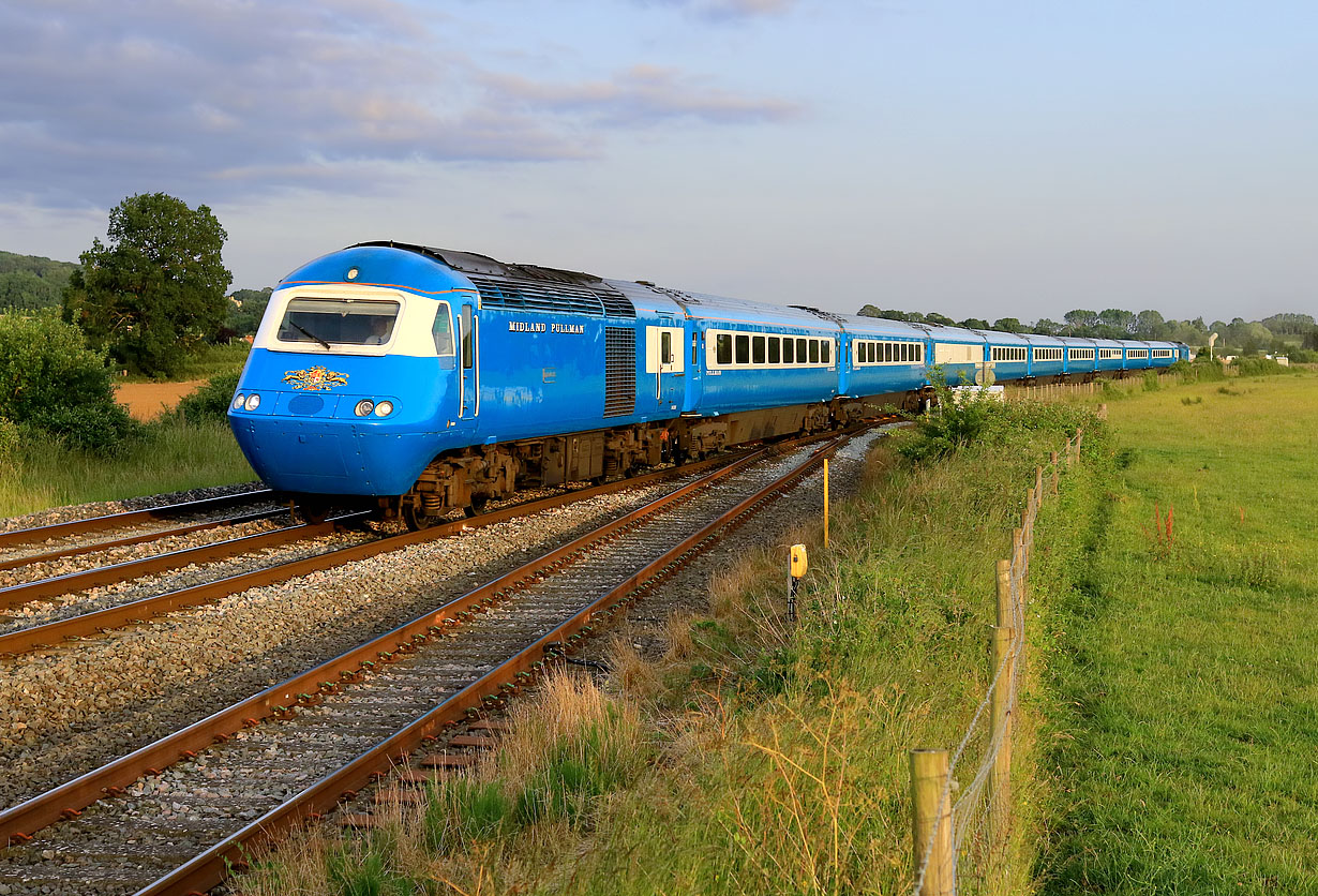 43049 Neville Hill passes Eckington on 11 June 2025 with the Midland Pullman 1Z45 16:48 Paignton to Hull 'Torbay Riviera Pullman' railtour. 43050 Loch Morar is bringing up the rear. This was running 14 minutes late, owing to being held at Gloucester for much longer than booked, due to a procession of delayed passenger services. Despite the delay, the light just managed to hang on, although it was bit anxious, as there were several areas of cloud floating around. |