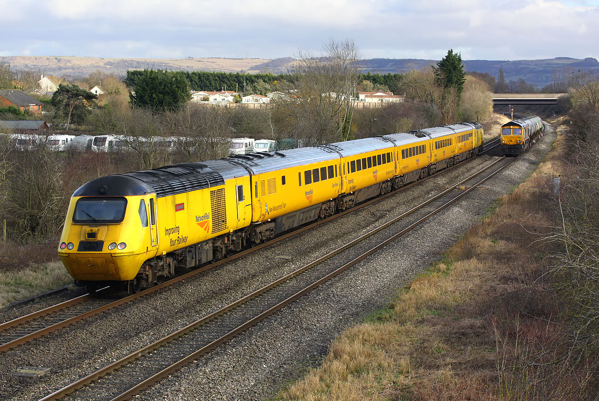 43062 John Armitt brings up the rear of the 1Z20 05:09 Reading Triangle Sidings to Derby RTC Network Rail test train at Badgeworth on 2 February 2018, with 43014 The Railway Observer leading. 66751 Inspiration Delivered - Hitachi Rail Europe is approaching with the 6Z78 11:09 Long Marston to Cardiff Docks Greenergy tank move. I had deliberately gone to this location as the two trains were due to pass at roughly the same time. However, I didn't expect them to be quite this close together! |