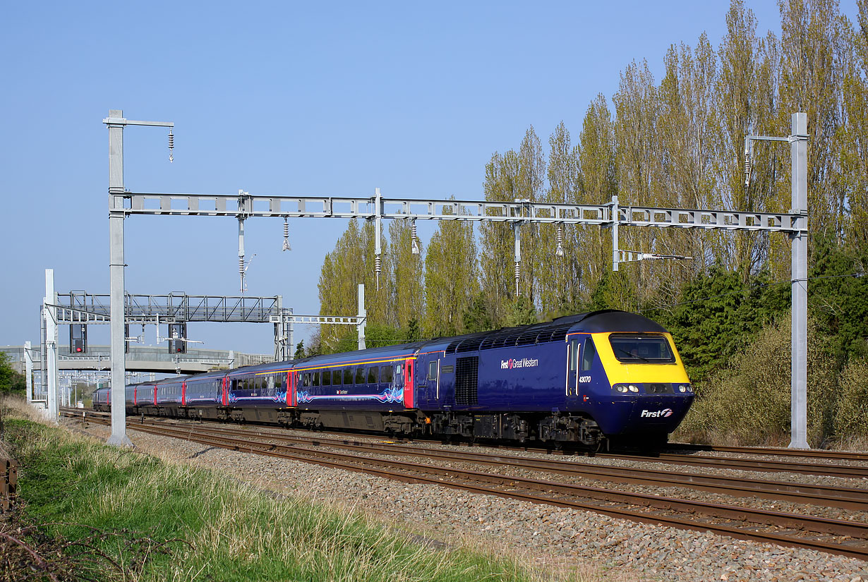 43070 The Corps of Royal Electrical and Mechanical Engineers passes Challow on 6 April 2017 with the 1L36 08:31 Cheltenham Spa to Paddington GWR service. This is the start of the four track section to Wantage Road, and consequently has these massive overhead structures, more reminiscent of the 1940s Woodhead electfrication, rather than a 21st Century line! |