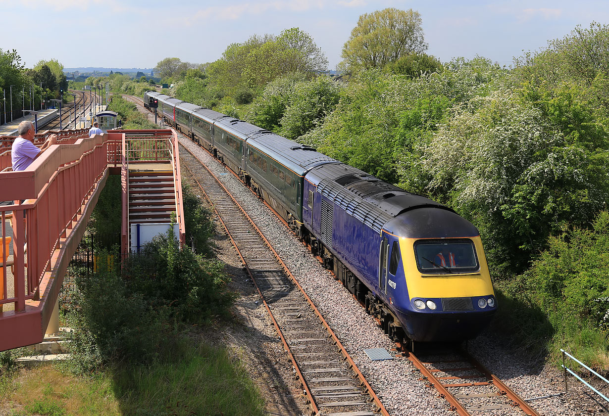43078 attracts some attention at Honeybourne on 16 May 2019, as it takes the Long Marston line with the 5Z43 09:43 Laira to Long Marston ECS. 43091 is bringing up the rear. Whilst HSTs were until recently commonplace on the tracks through the station on the left, it is only these off lease storage moves that bring them to this line. |