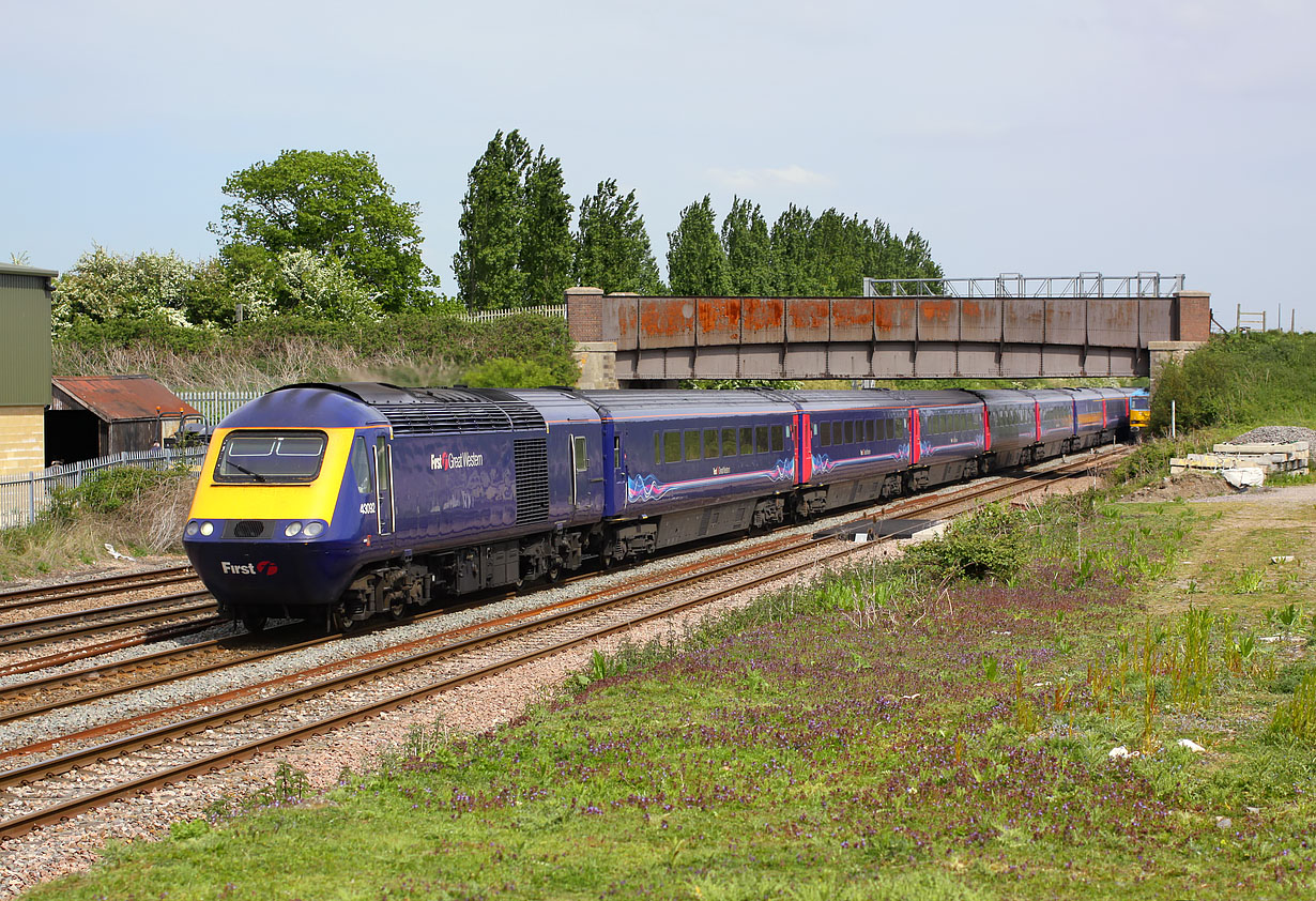 43092 speeds past the site of Challow station on 12 May 2009 with the 1B40 13:45 Paddington to Swansea First Great Western service. Look what's peeking out from behind the roadbridge, yes, its light blue liveried 60074 Teenage Spirit working the 6B33 13:42 Theale to Robeston Murco oil empties. Normally this train waits in the loop for a couple of HSTs to pass, however today it had to wait for thirty minutes while four HSTs sped by. |