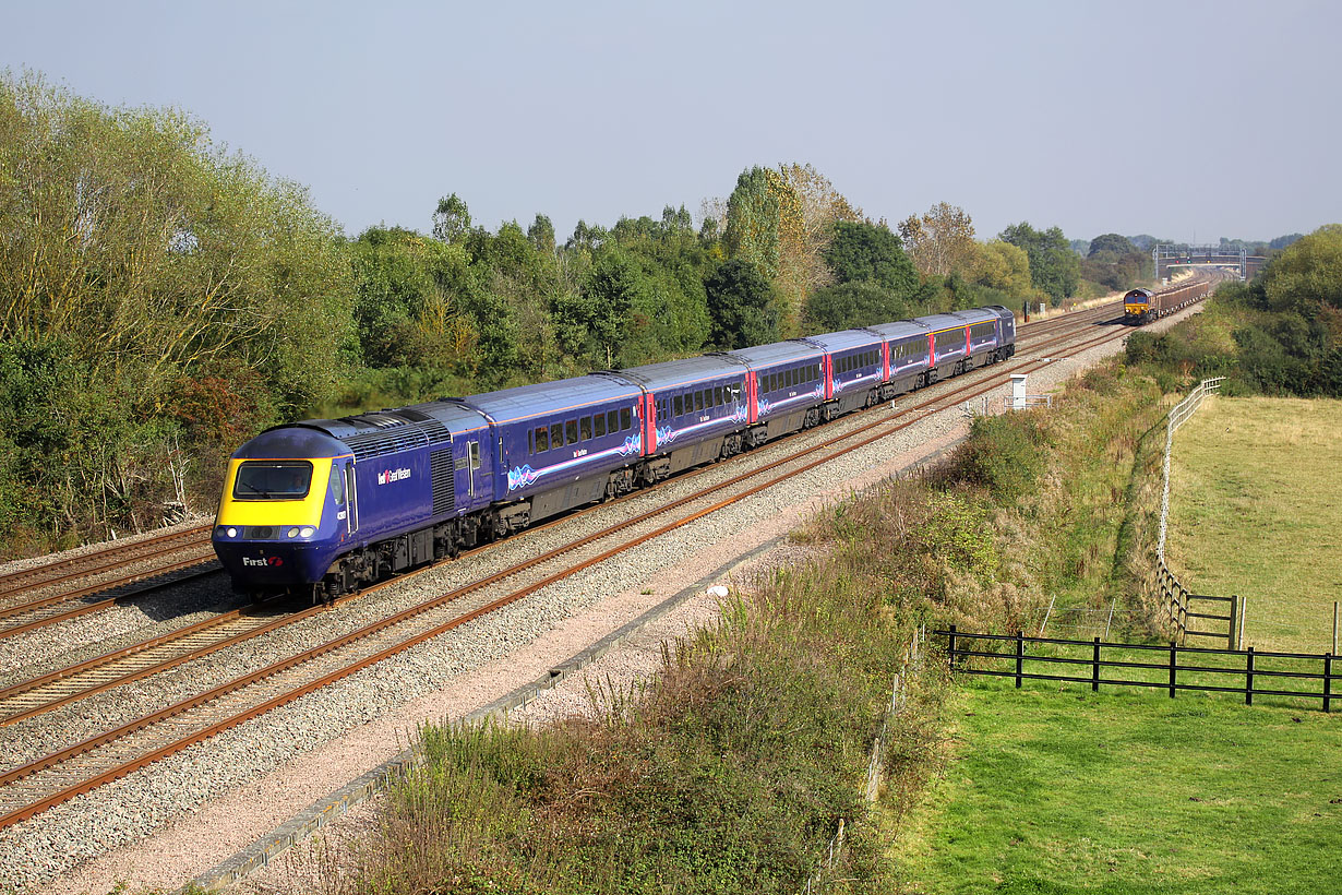 43127 Sir Peter Parker 1924 - 2002 Cotswold Line 150 speeds past Circourt Bridge, Denchworth on 22 September 2014 with the 1C15 13:00 Paddington to Bristol Temple Meads First Great Western service, rapidly overtaking 66087 which is slowly proceeding along the down relief line with the 7C54 13:06 Oxford Banbury Road to Westbury Mendip Rail stone empties. |
