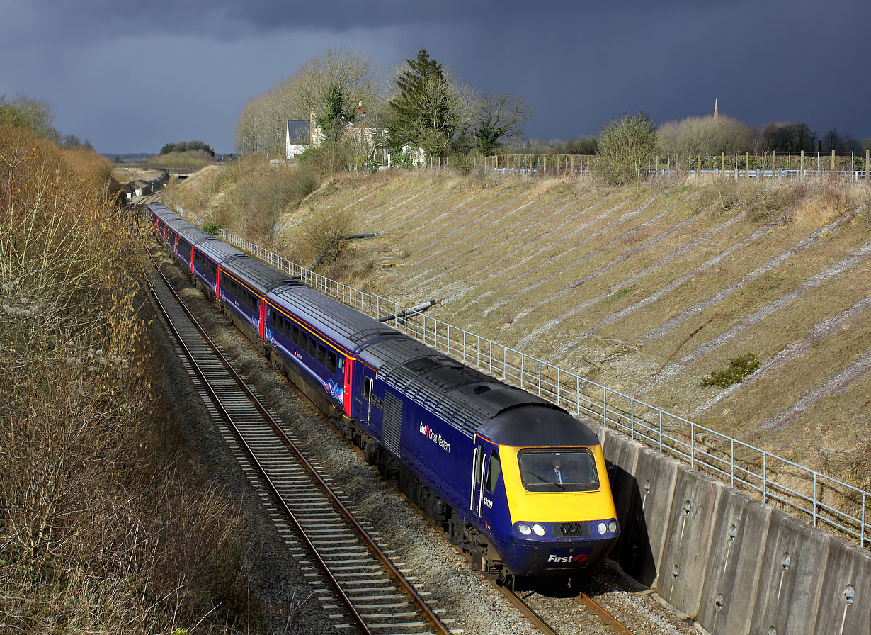 43139 Driver Stan Martin 25 June 1950 - 6 November 2004 passes Kemble Wick in stunning light on 4 March 2016 with the 1L58 12:36 Cheltenham Spa to Paddington GWR service. While the Kemble area is bathed in spring sunshine (note the spire of All Saint's church in the background), a few miles to the north it is as black as night, and the rain and sleet is coming down. I know this for certain, as I had just driven through it! |
